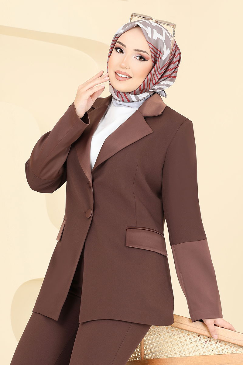 The Satin Detailed Jacket Set offers elegance and comfort together, suitable for all seasons. The luxury touch of Dabil and satin fabrics with a double-breasted collar and lined design stands out. The product has front buttons, as does the trousers. Suitable only for dry cleaning, this set is showcased on a model wearing size 38 with measurements: Height: 165 cm, Chest: 80 cm, Waist: 68 cm, Hips: 96 cm, Weight: 54 kg.
