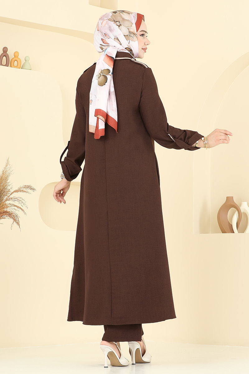 Şık ve konforlu bir seçim olan Şerit Detay Tesettür Takım, dört mevsim rahatlıkla kullanılabilir. Hassas yıkama ile 30 derecede yıkanabilir. Sofia Keten kumaştan üretilmiş olan bu ürün, gizli düğmeleri ve şık gömlek yakası ile dikkat çeker. Tunik yan yırtmaç detayına sahip olup, astarsızdır. Pantolon beli lastikli olarak tasarlanmıştır ve hem tunikte hem de pantolonda bulunan cep detayları şıklığı tamamlar. Her ortamda rahat ve şık olmanızı sağlayacak bu tesettür takım ile stilinizi bir adım öne taşıyın.