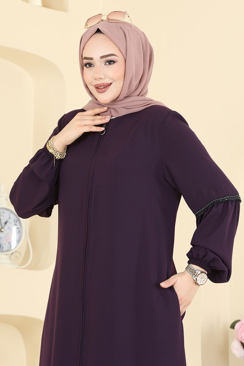 Şerit Detaylı Fermuarlı Ferace 0503ORG1169 Mürdüm