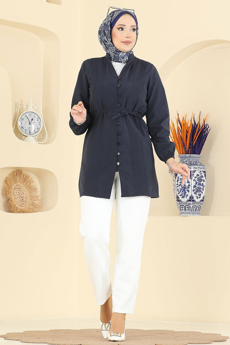 Offering both elegance and comfort, the Nervure Detailed Terrycotton Shirt is a design that you can comfortably choose throughout the four seasons. Washable at 30 degrees on a delicate cycle, this shirt features a V-neckline, front button closure, and elastic cuffs that make it stand out. This unlined model with a lace detail upholds modesty and comfort in modest fashion. The lace can be optionally omitted based on personal preference.
