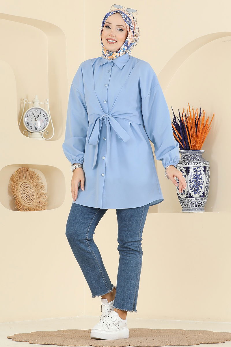 The Front-Tie Terrycloth Shirt offers a modern and stylish design that ensures comfort throughout all seasons. It can be washed at 30 degrees on a gentle cycle for easy maintenance. Featuring front button details and elastic cuffs, this shirt provides both comfort and an elegant look. It is unlined and designed to comply with modest dressing standards. The shirt collar adds a touch of both classic and contemporary style.