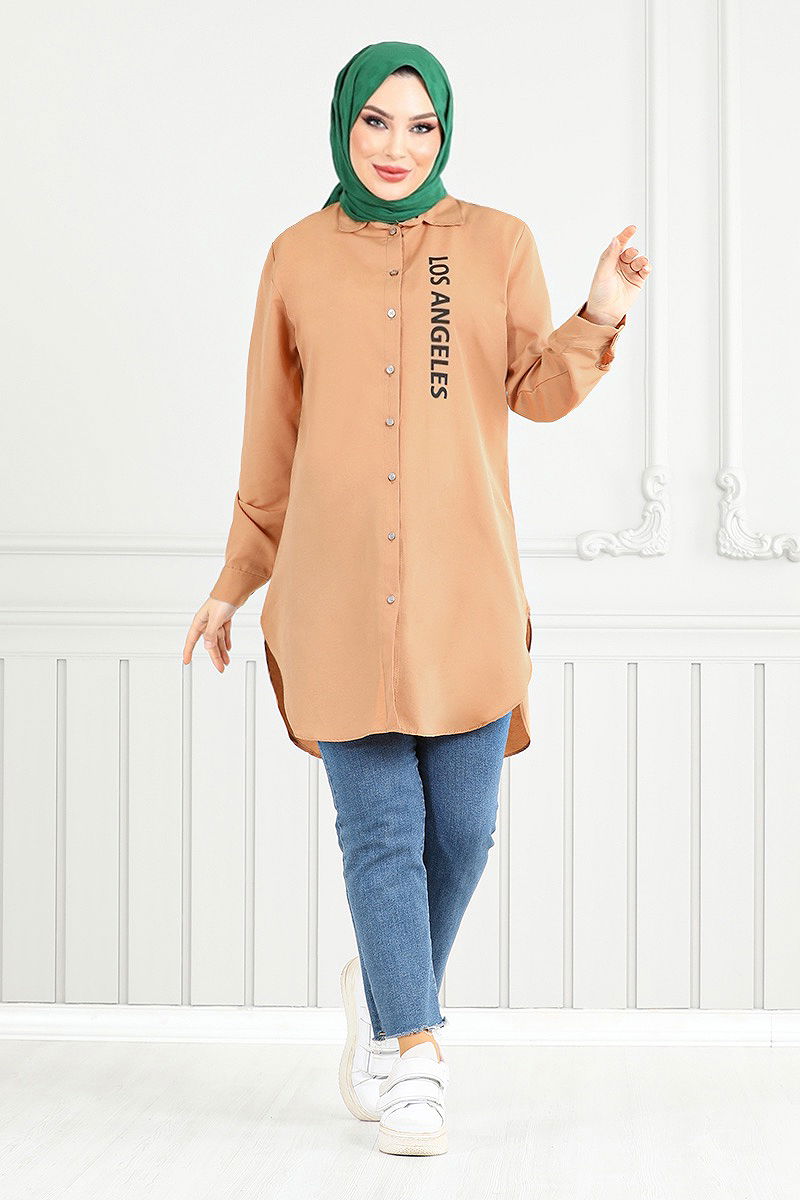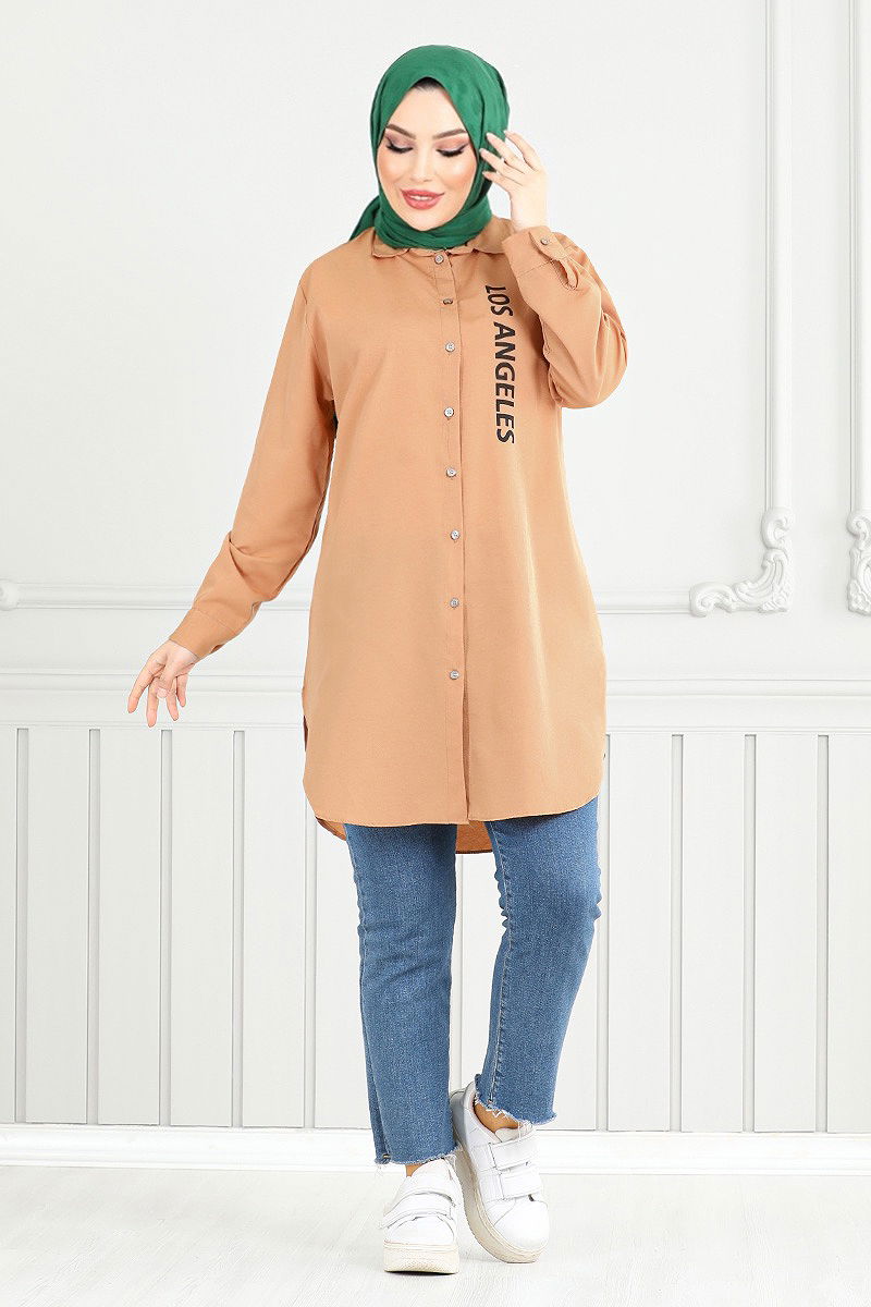 Product Feature : It is a new season hijab fashion product. The product has a Shirt collar. The product has From the front buttons. Unlined. The writings are in print. Cuff buttons are active. There may be a tonal difference in the product due to concept photo shoots.