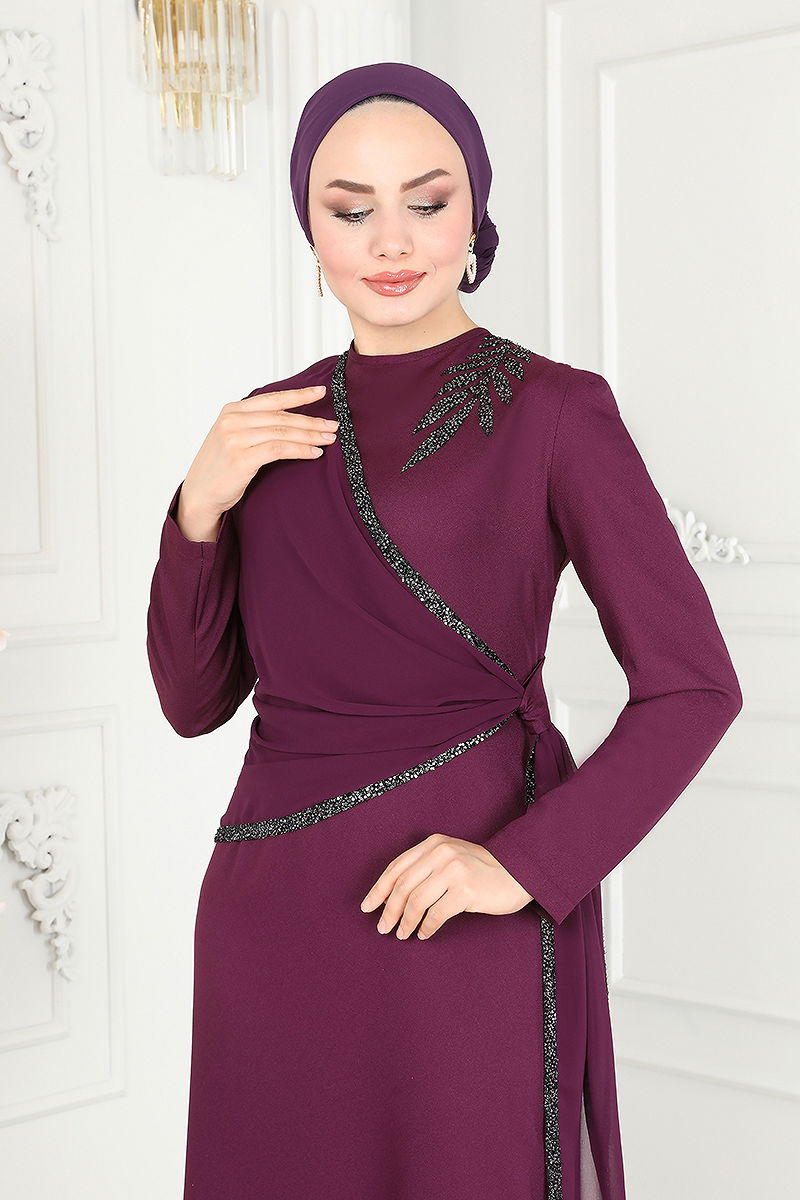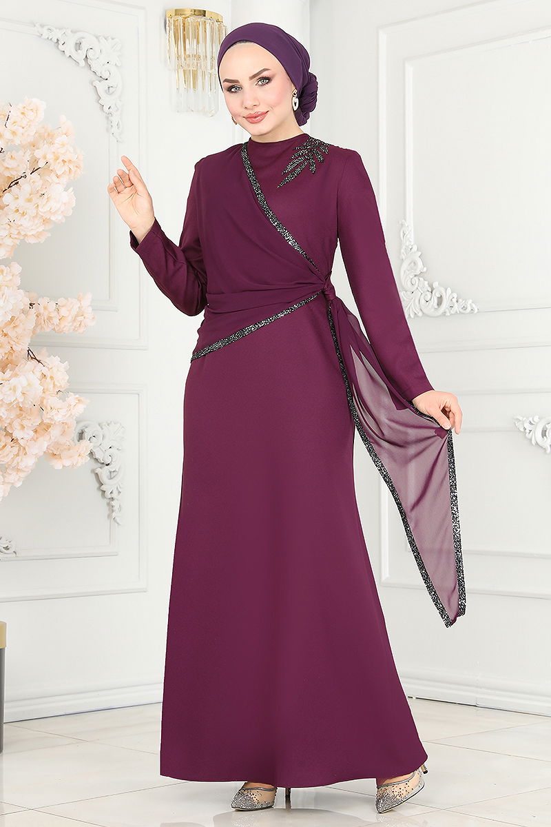 Şifon Detaylı Payetli Abiye Elbise ASM2691 Mürdüm
