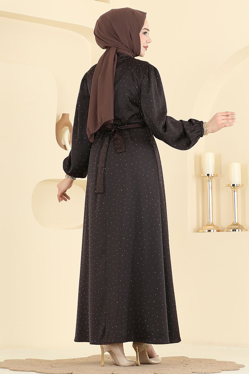 Şık Kemerli Saten Abiye 6138ORG1169 Kahve