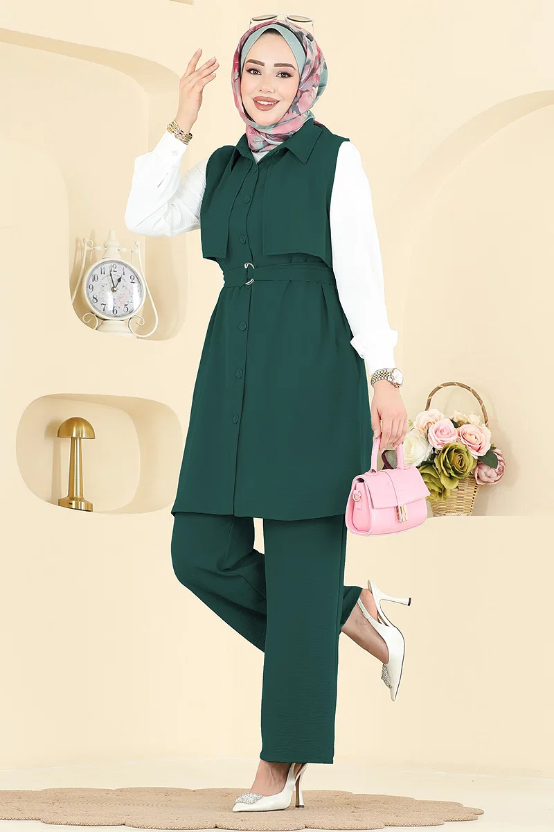 Şık ve modern tasarımıyla dikkat çeken Şık Kuşaklı Üçlü Takım, tesettür giyimde yeni bir soluk getiriyor. Dört mevsim rahatlıkla kullanabileceğiniz bu kombin, aerobin kumaşı sayesinde gün boyu konfor sağlar. Hassas yıkama ile 30 derecede yıkanabilen ürün, yarım hakim yaka ve önden düğmeli tasarımıyla pratik bir kullanım sunar. Kemer detayı ile stilinizi tamamlayabilir, elastik pantolon beli ile rahat hareket edebilirsiniz. Yelek, bluz ve pantolondan oluşan bu şık kombin, manşet düğmeleri ile tamamlanmıştır.