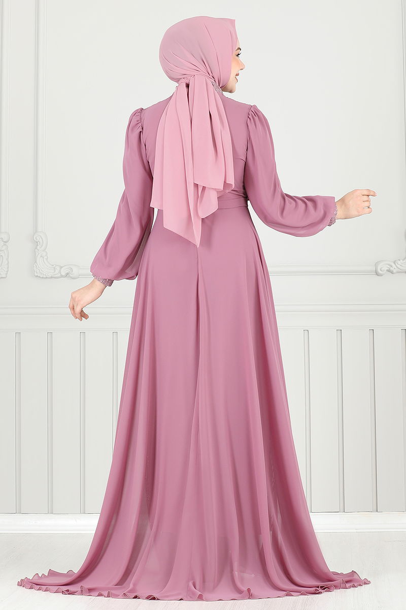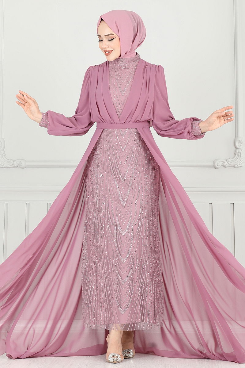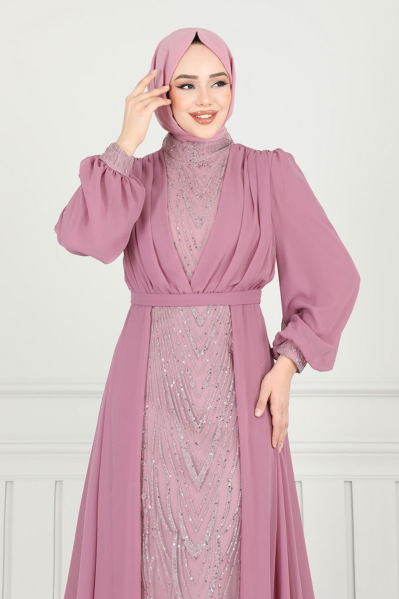 Sim Detay Pelerinli Abiye 6630YG95 Gül Kurusu