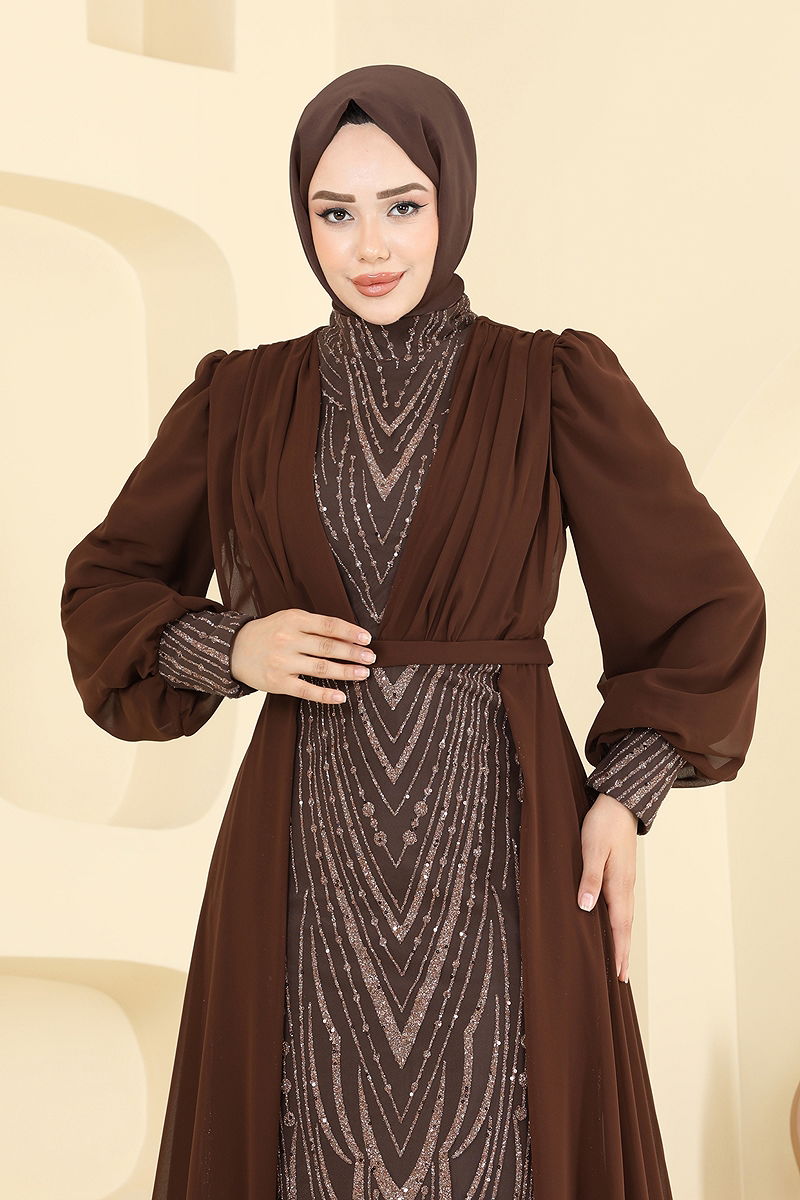 Etkileyici Sim Detaylı Pelerinli Abiye; dört mevsim şıklığınızı koruyabilmeniz için tasarlandı. Sadece kuru temizleme ile bakımı yapılabilecek bu özel tasarım, simli şifon kumaşla birleşerek zarif bir görünüm sunar. Yarım hakim yaka ve astarlı yapısı ile konforu artırırken, sırttan fermuarlı tasarımı kolay kullanım sağlar. Modelin bel kısmındaki dikiş detayları ise şık bir siluet çizer. Bu tesettür uyumlu abiye, her özel gününüzde göz kamaştırmanız için idealdir.