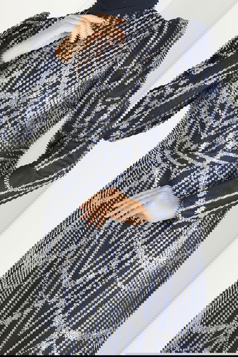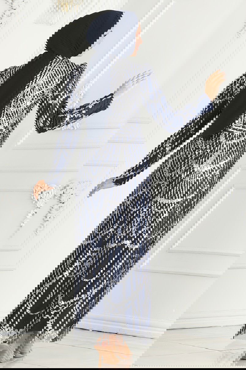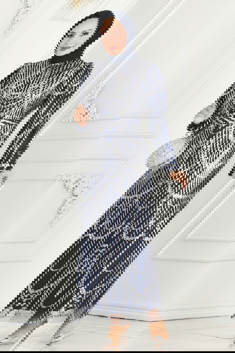 Simli Kalem Abiye model tesettür ürünüdür. Dört Mevsim sezonunda kullanılabilir. Sadece kuru temizleme yapılmalıdır. Birinci sınıf Simli Tül kumaştan imal edilmiştir. Ürün Yarım Hakim yakadır. Astarlıdır. Ürün Arkadan fermuarlıdır. (Modelin üzerindeki ürün 38 bedendir) Boy: 160 cm, Göğüs: 86 cm, Bel: 68 cm, Basen: 95 cm, Kilo: 52 kg. Kemer dikilidir. Pullar yapıştırmadır.