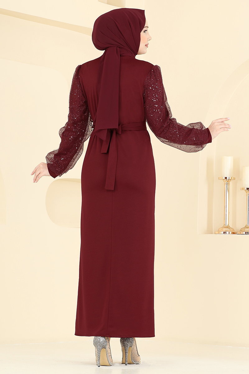 Simli Tül Kollu Abiye 5760EDF311 Koyu Bordo