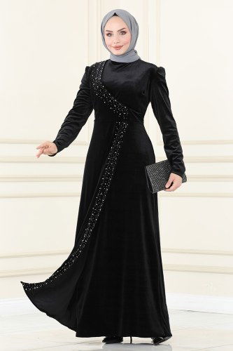 İnci İşlemeli Kadife Abiye ASM2407 Siyah