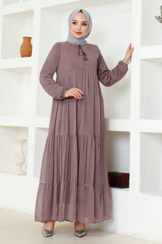 Yarım Düğmeli Tül Elbise ANT2205-M Gül Kurusu