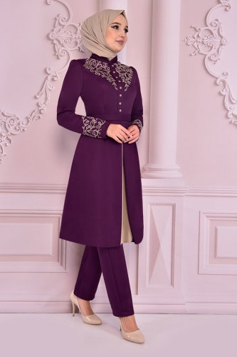 Aksesuar Düğmeli Pantolonlu Takım ASM2506-M Mürdüm