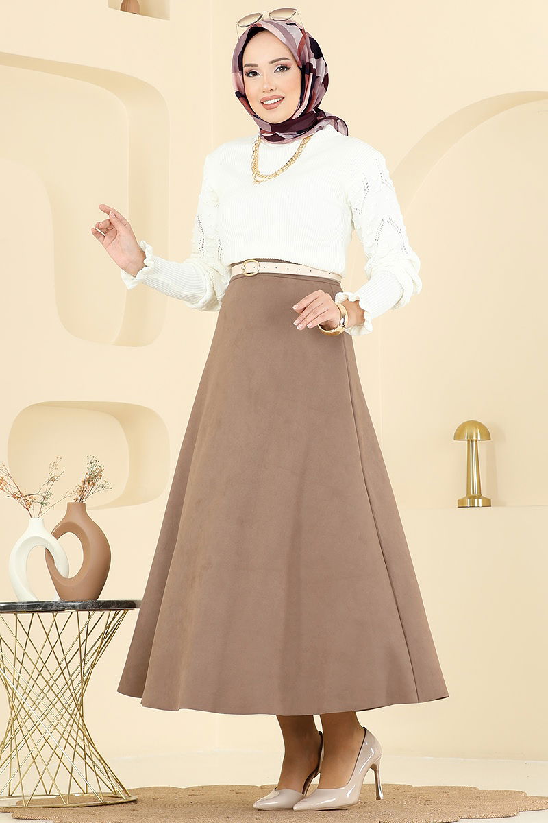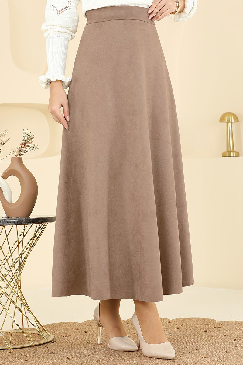 Product Name: Elastic Waist Suede Skirt - This elegant modest skirt is perfect for autumn and winter seasons. Washable at 30 degrees on a gentle cycle, this suede skirt offers day-long comfort with its elastic waist. Being unlined, it can be easily paired with various tops. (The product on the model is size S.)