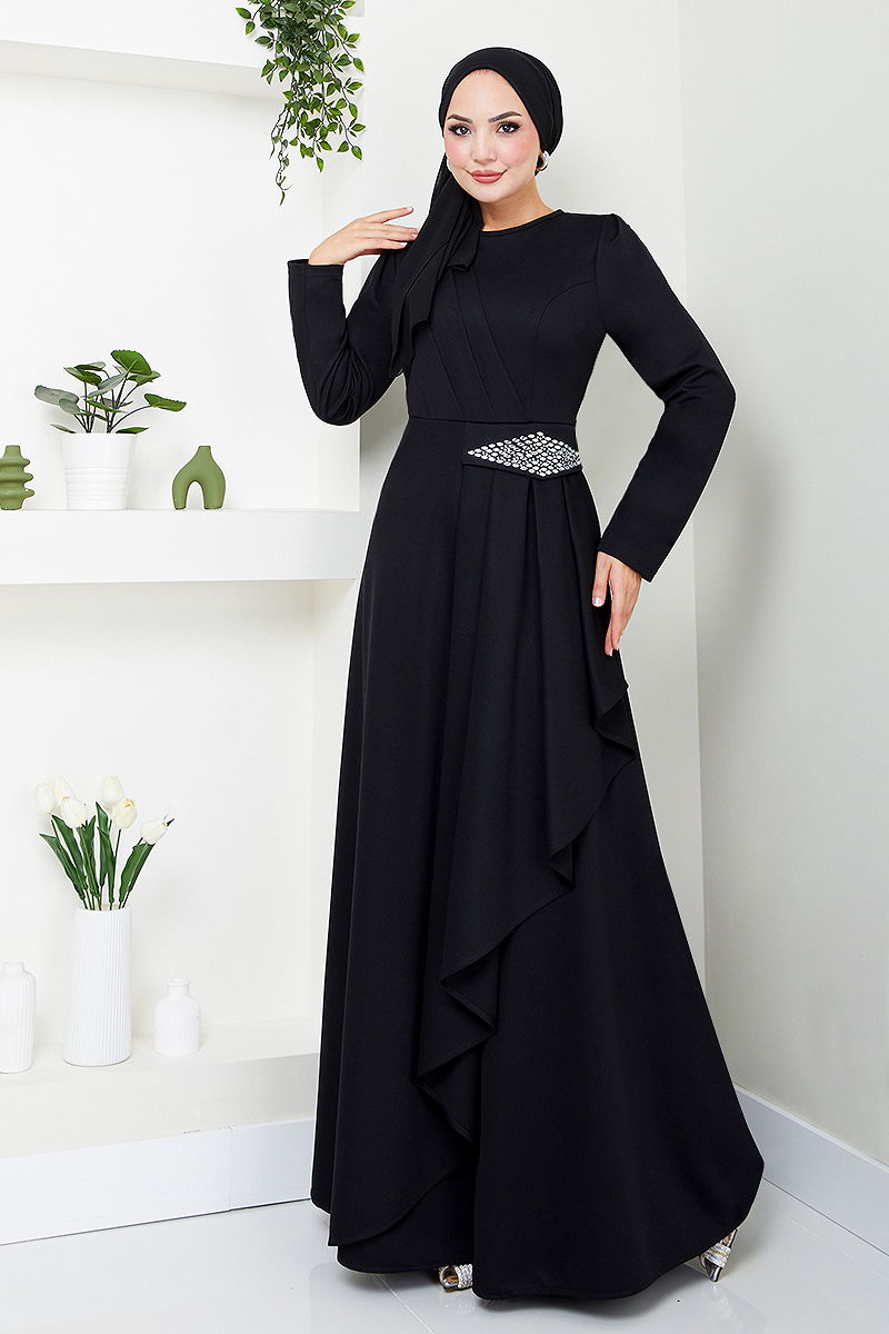 فستان حجاب مفصل بالحجر أسود