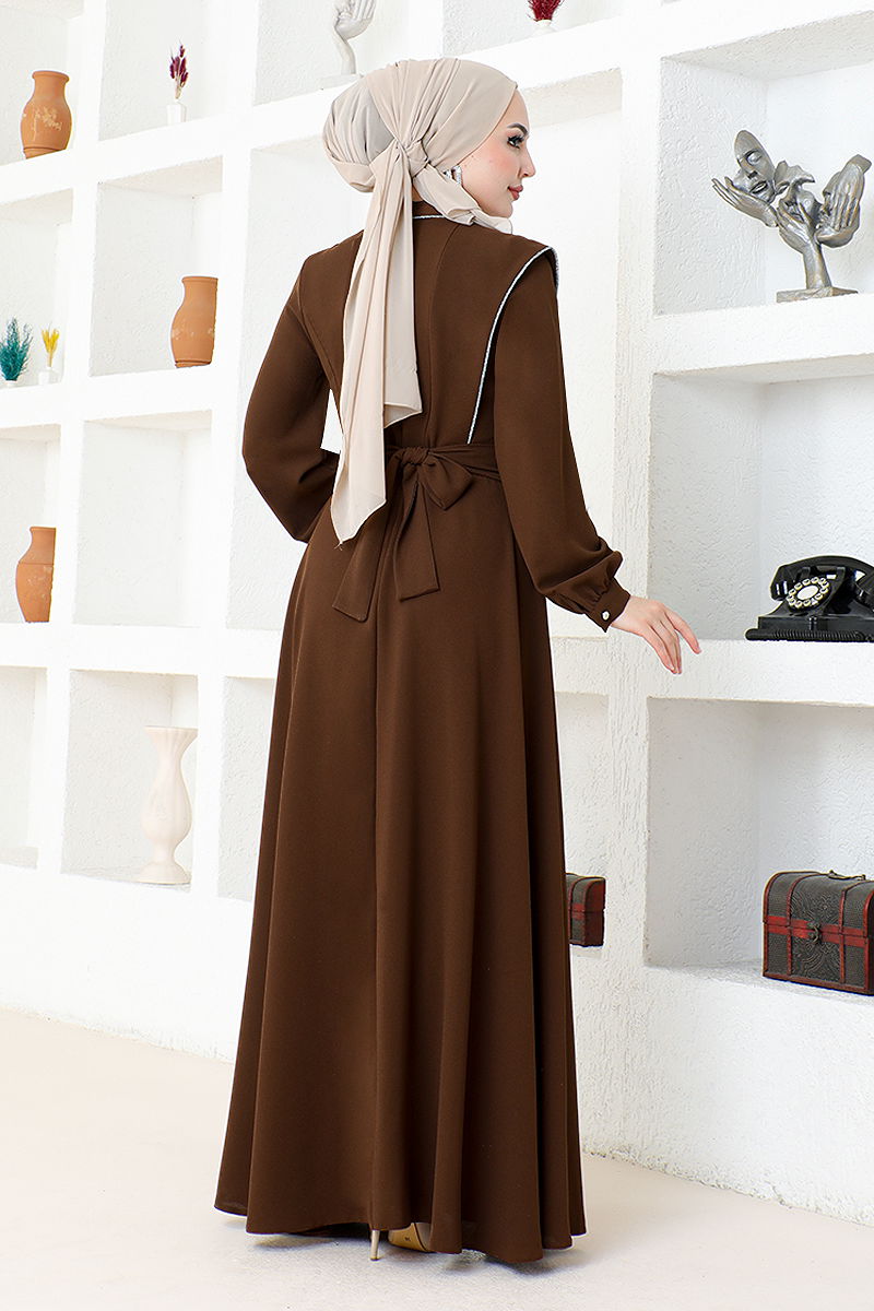 فساتين سهرة محجبة بتفاصيل حجرية قهوة محجبة