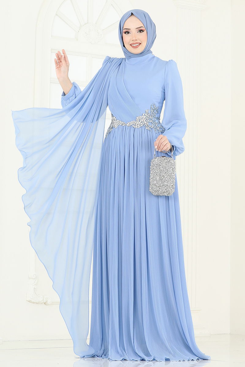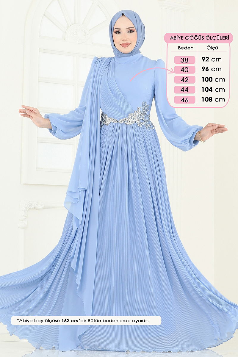 The SUAL Stone Waist Cloaked Evening Dress is an elegant choice for your special occasions. Suitable for all seasons, this model requires only dry cleaning. Made from chiffon fabric, it offers both elegance and comfort. Its mandarin collar and lined design provide comfortable wear, while the back zipper design allows easy dressing. The button detail on the back and the chiffon cloak enhance the aesthetic appearance of the dress. The stone details add an eye-catching sparkle.