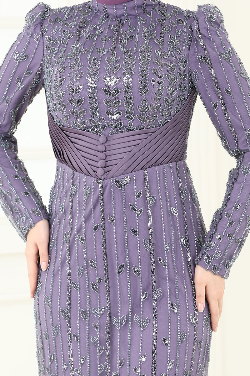 Suitable for all-season wear, this dress is perfect for special occasions, providing a stunning appearance. Made from gemstone-studded satin fabric, the dress is lined for comfort. It features a mandarin collar design and is zipper-backed for easy wear. Only dry cleaning is advised for maintenance. The buttons are added as a visual accessory to enhance the apparel’s elegance. The product displayed is size 38.