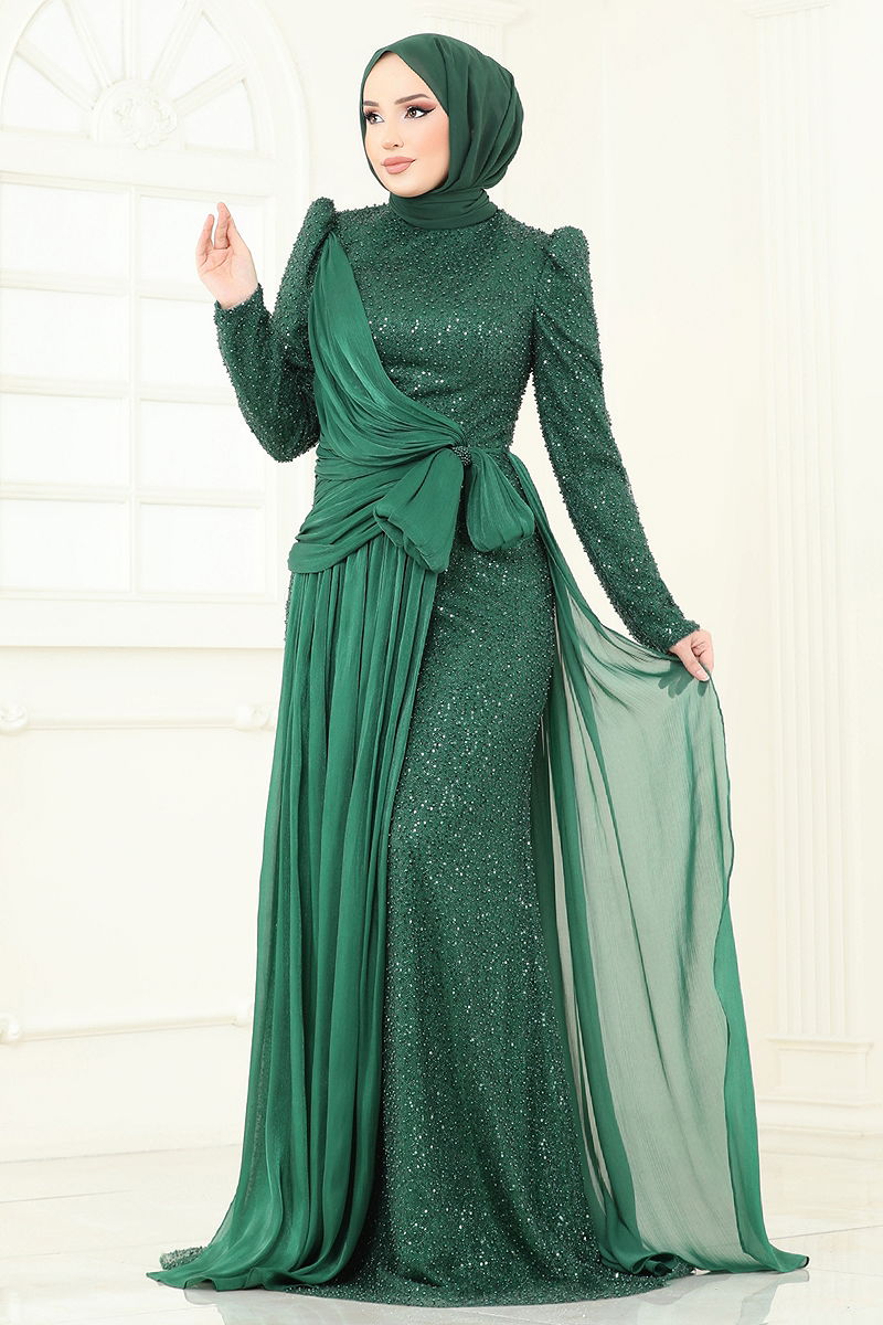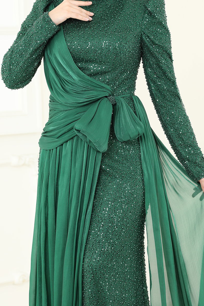 Designed for your most special occasions, the SUAL Embroidered Tail Detail Evening Dress is an ideal choice for those who love modest fashion. Suitable for all seasons, this dress brings the elegance of organza fabric to your silhouette. With its bike neck and lined design, it prioritizes comfort while offering easy use with its zipper back. The sparkling sequin details add a dazzling elegance. Note: The product on the model is size 38; should be dry cleaned only.