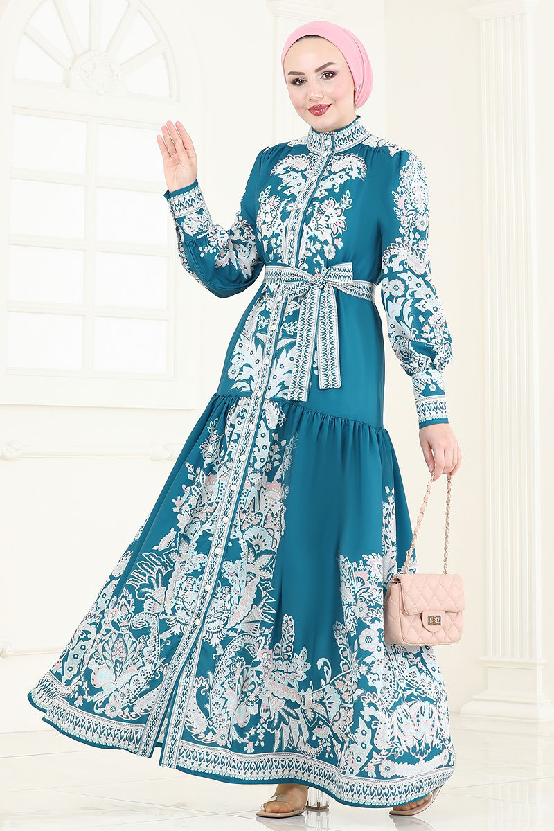 Kemerli Desenli Elbise, dört mevsim rahatlıkla kullanabileceğiniz bir tesettür modelidir. Krep kumaştan üretilen bu zarif elbise, hassas yıkamaya uygun olup 30 derecede yıkanabilir. Hakim yaka tasarımı ile şıklığına şıklık katarken, astarsız yapısı ile hafif ve konforludur. Ürün 38 bedendir ve manşet düğmeleri aktiftir. Kemer, dikişsiz orta kısmıyla birlikte verilmekte olup, isteğe bağlı çıkarılabilir. Bu elbise ile şıklığınızı her ortamda koruyun.