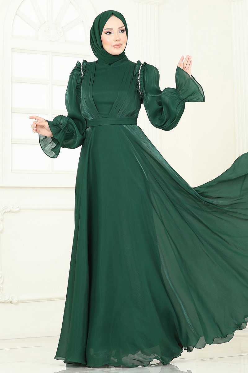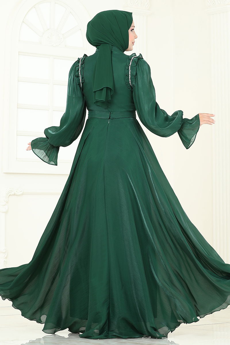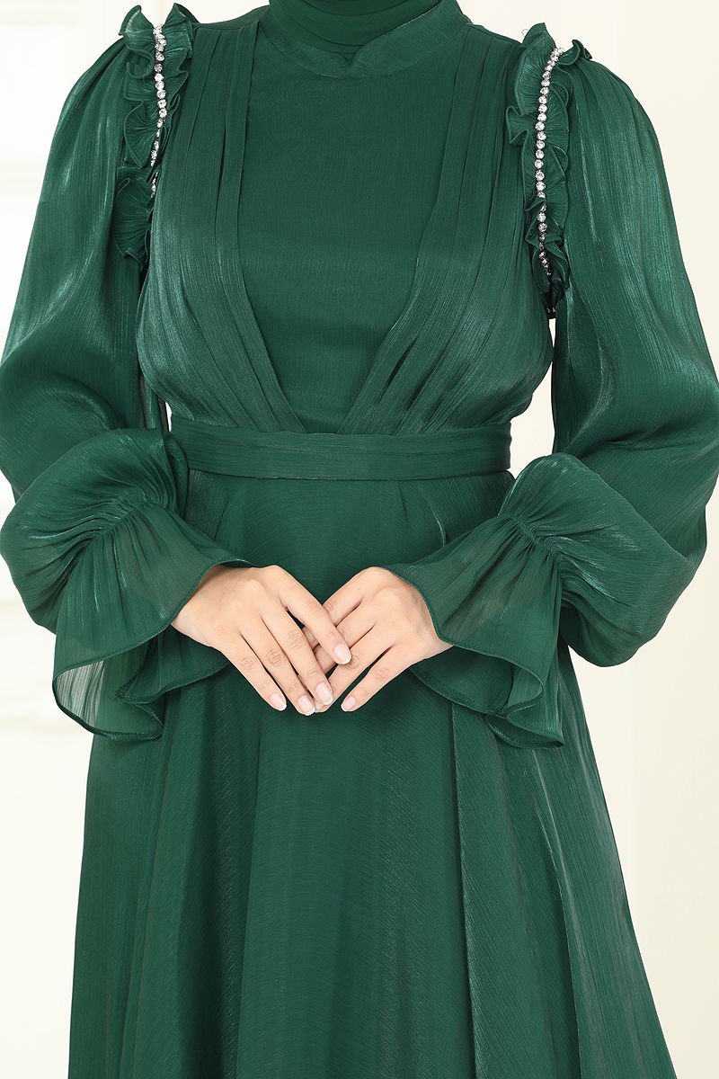 SUAL Omuzu Fırfır Detaylı Abiye Zümrüt