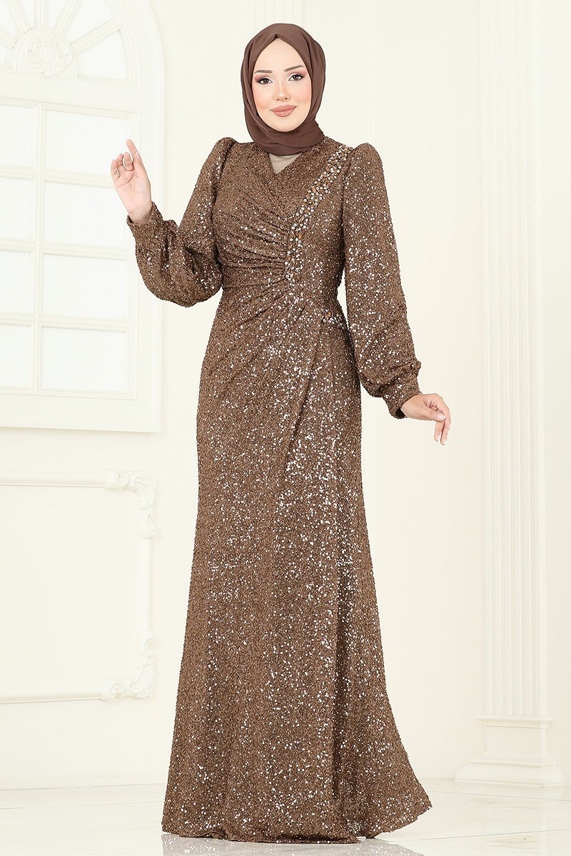 The SUAL Drape Detail Evening Gown encapsulates elegant modest fashion with its exquisite design. Suitable for all seasons, this piece should be dry cleaned only. Adorned with sparkling sequins and beads, this model features a V-neckline and balloon sleeves, offering a modern and stylish look. The back zipper, lined structure, and bust pads enhance comfort, while the stitched waistline and stone details create an eye-catching silhouette.