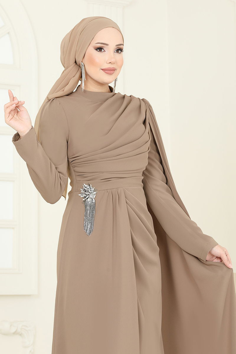 SUAL Draped Front Stoned Evening Dress is a modest fashion item suitable for all seasons. Made from imported crepe fabric, this elegant dress features a semi-mandarin collar and is fully lined. It has a zipper closure at the back, and the waist is sewn to enhance the silhouette. The dress displayed is size 38. The cape is intricately attached to the dress. Dry clean only.