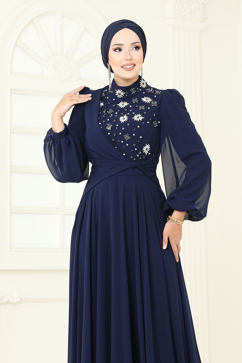 Şık ve modern tasarımıyla dikkat çeken SUAL Önü Taşlı Şifon Abiye, tesettür giyim için ideal bir seçenektir. Dört mevsim rahatlıkla kullanabileceğiniz bu abiye, 30 derecede hassas yıkama ile temizlenebilir. Şifon kumaş kullanılarak üretilen bu ürün, yarım hakim yaka tasarımına sahiptir ve astarlıdır. Sırttan fermuarlı olan abiye, kolay kullanım sunar. Üzerinde şık taş detayları bulunan bu model, özel günlerinizde göz kamaştırmanızı sağlar. Modelin üzerindeki ürün 38 bedendir.