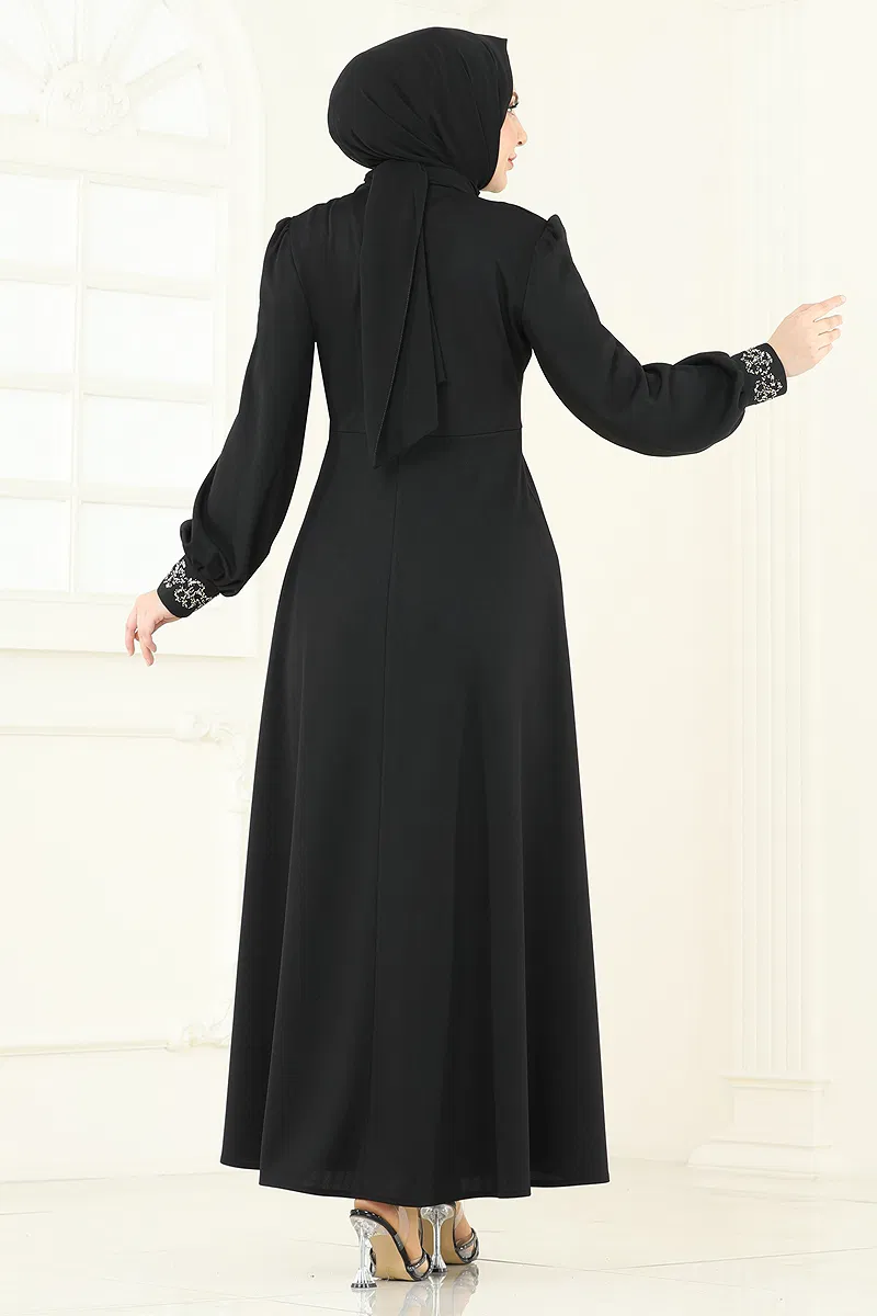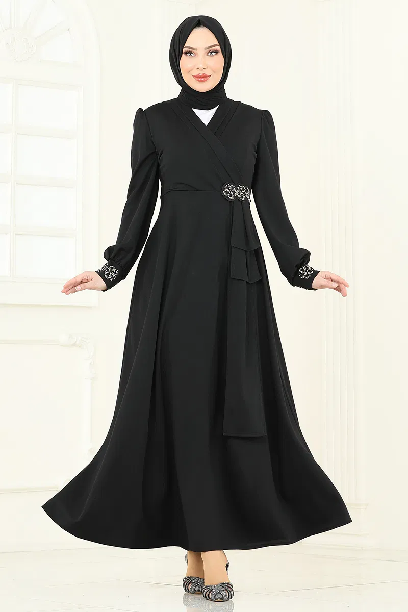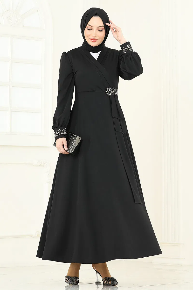 Kruvaze Yaka Abiye Elbise, tesettür modasına uygun şık bir seçenektir. Dört mevsim boyunca rahatlıkla giyebileceğiniz bu elbise, özel dabıl kumaşı ile üretilmiştir. Sade ve zarif tasarımı V yaka detayı ile tamamlanmaktadır. Ürün, astarsız bir yapıya sahiptir ve kuru temizleme ile temizlenmelidir. Kafadan geçirme kolaylığı ve yapıştırma taş detayları ile dikkat çeken bu elbiseyle göz kamaştırıcı bir görünüme kavuşacaksınız. Modelin giydiği elbise 38 bedendir ve ölçüleri: Boy: 167 cm, Göğüs: 90 cm, Bel: 70 cm, Basen: 100 cm, Kilo: 59 kg.