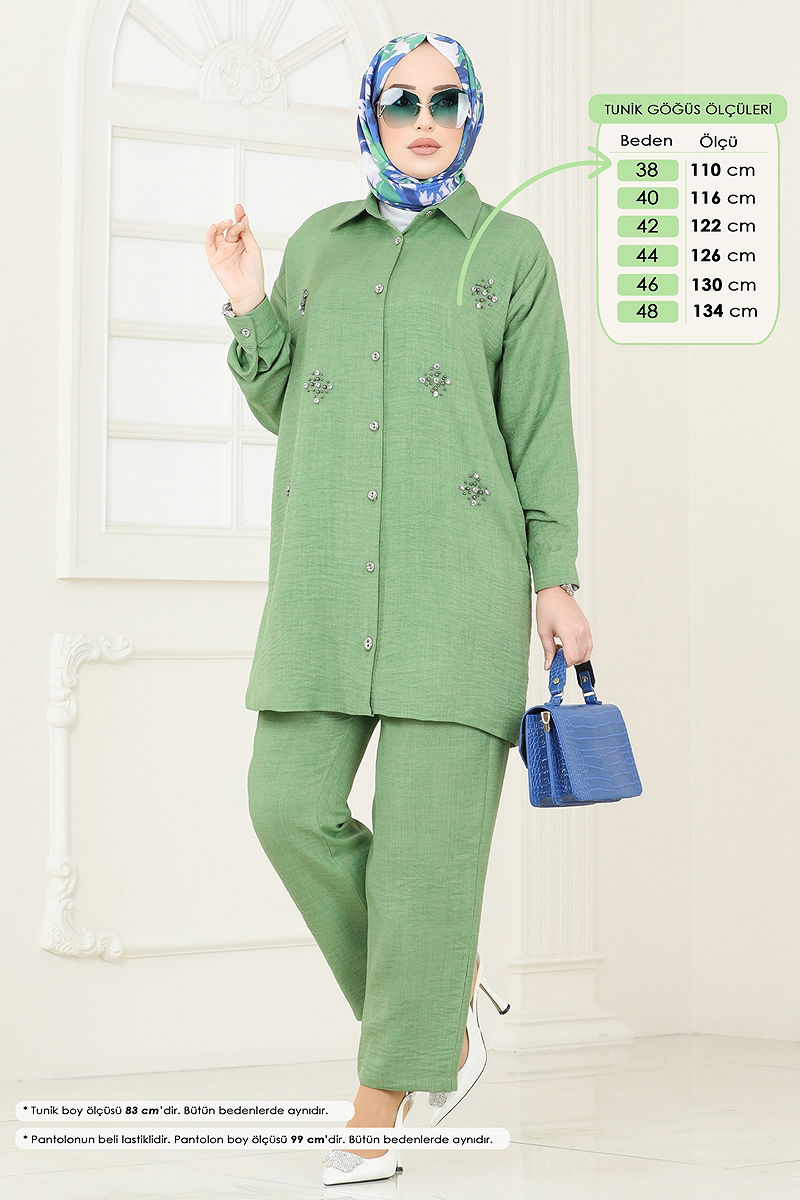Product Feature : It is a new season hijab fashion product. The product has a Shirt collar. The product has From the front buttons. Unlined. Stone details are pebble. The waist of the trousers is elastic. Cuff buttons are active. There may be a tonal difference in the product due to concept photo shoots.