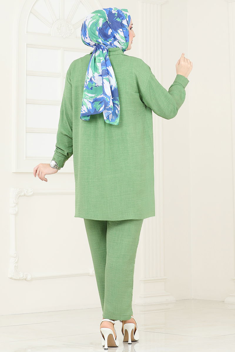 Ürün Özelliği : Yeni sezon tesettür moda ürünüdür. Ürün Gömlek yakadır. Ürün Önden düğmelidir. Astarsızdır. Taş detayları çakımdır. Pantolon beli lastiklidir. Manşet düğmeleri aktiftir. Konsept fotoğraf çekimlerinden dolayı üründe ton farklılığı olabilir.