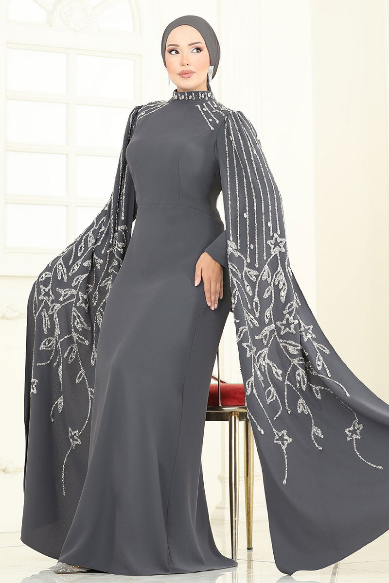 Elegance and style come together in the Stone Detail Cape Evening Dress, designed for modest fashion. Suitable for all seasons, this unique design is made from imported Crepe fabric and requires only dry cleaning. It features a half-mandarin collar, an unlined design, and a back zipper for comfortable wear. The size 38 on the model is adorned with eye-catching details; beads and stone details are hand-applied, while cape details are carefully sewn. With breast pads and stitched waist, this evening dress is perfect for accompanying you on every special occasion.