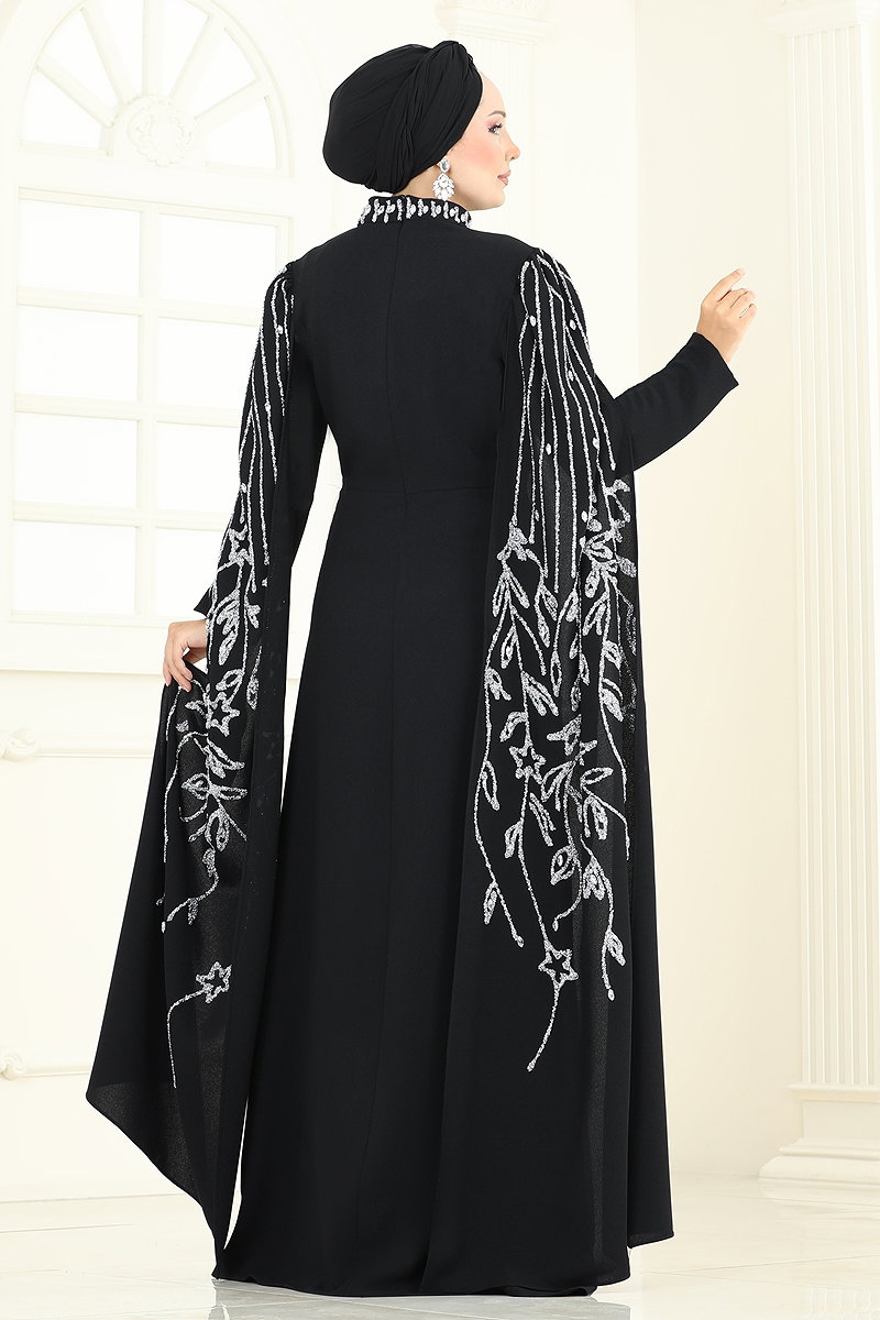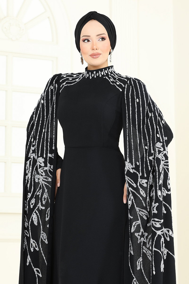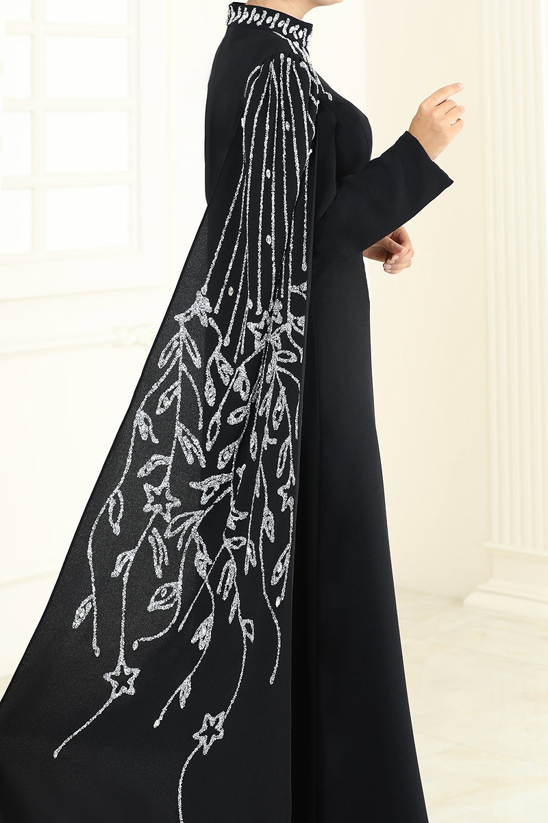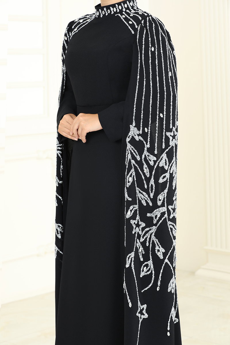 Taş Detay Pelerinli Abiye Siyah