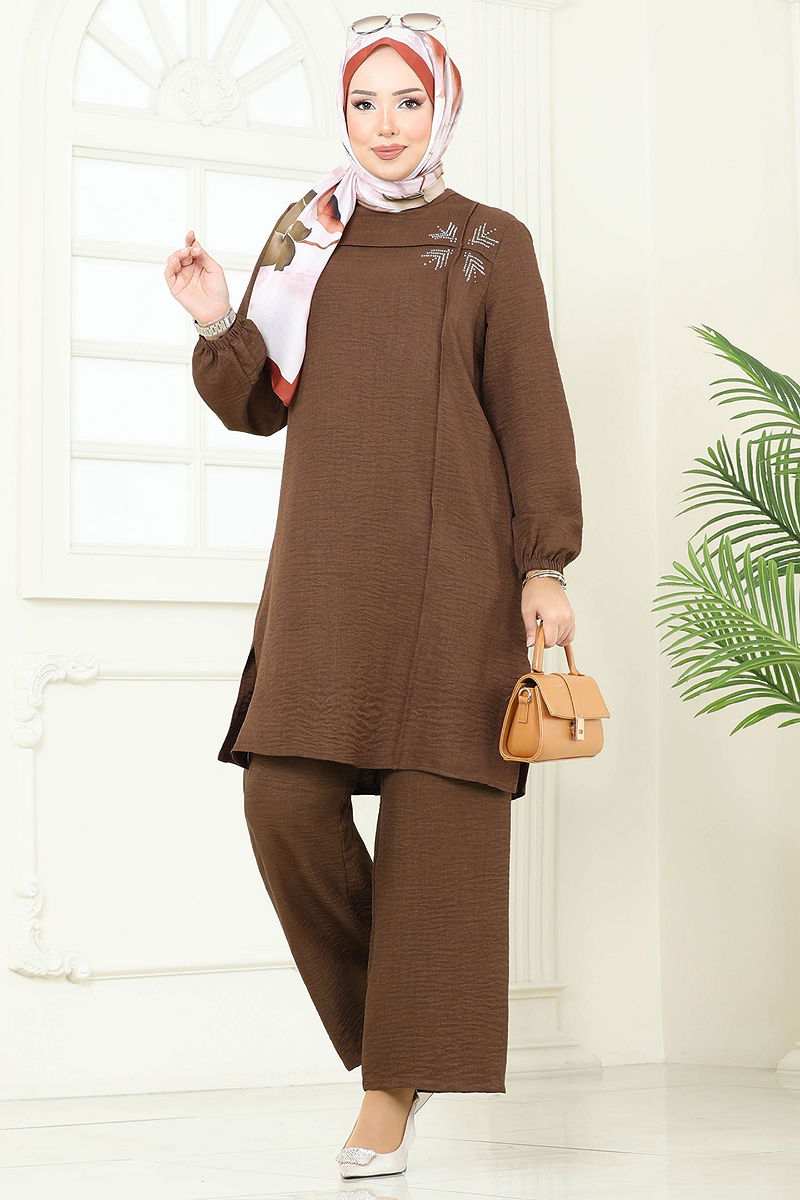 Ürün Özelliği : Yeni sezon tesettür moda ürünüdür. Ürün kafadan giyilmektedir. Sırttan kullanılabilir bir düğmesi bulunmaktadır. Ürün Bisiklet yakadır. Tunik yandan yırtmaçlıdır.. Astarsızdır. Taşlar yapıştırmadır. Pantolon beli lastiklidir. Manşet lastiklidir. Konsept fotoğraf çekimlerinden dolayı üründe ton farklılığı olabilir.