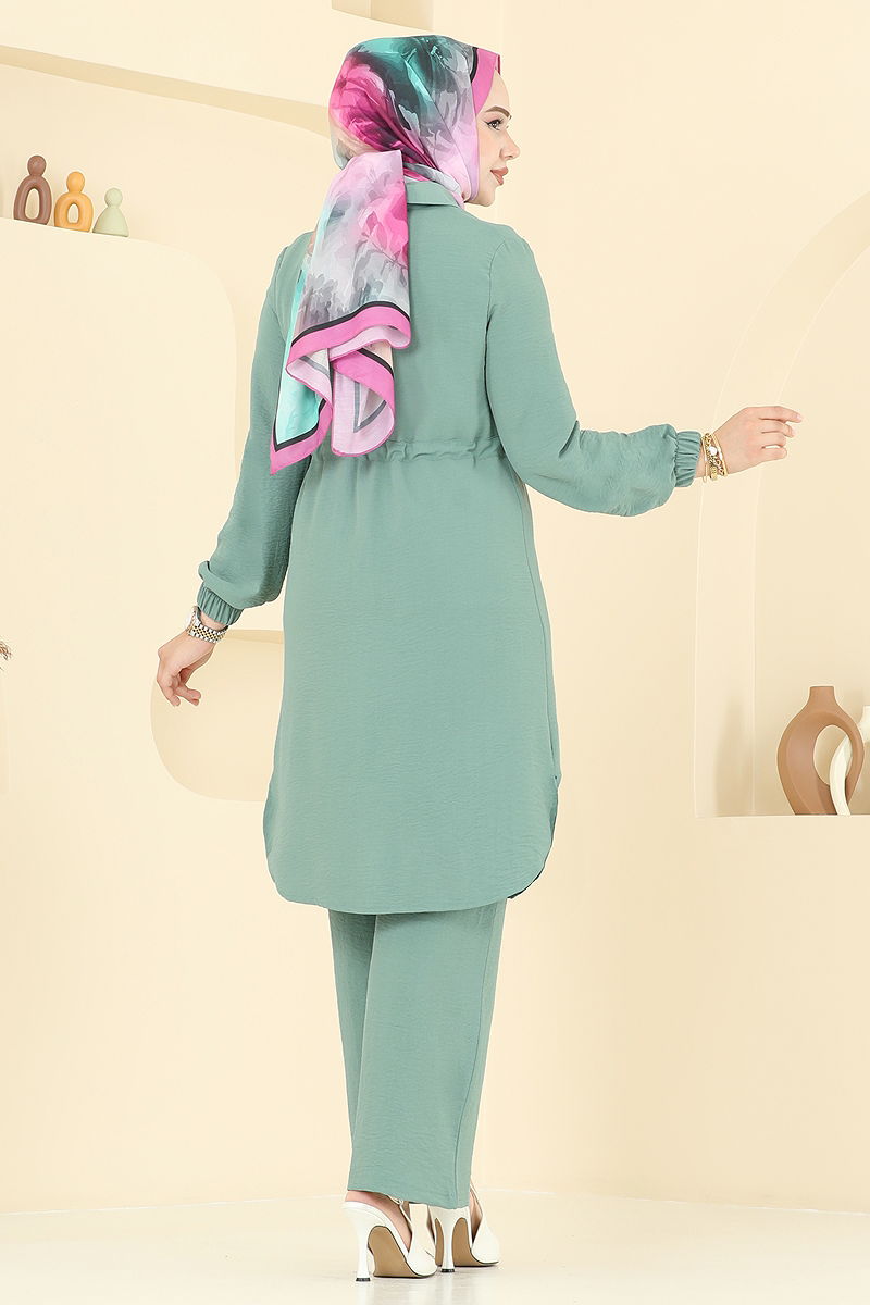 Taş Detaylı Aerobin Takım KOMBİN, tesettür tasarımı ile dikkat çekerken, dört mevsim boyunca rahatlıkla kullanabilirsiniz. Hassas yıkama ayarı ile 30 derecede yıkanabilir. Aerobin kumaştan üretilen bu takım, şıklığı konforla birleştiriyor. Gömlek yaka ve ön düğmeli tunik tasarımı, yanlarda yırtmaç detayı ile hareket özgürlüğü sağlar. Ürün astarsızdır ve beli bağcıklıdır. Pantolonun beli lastiklidir ve hem tunikte hem de pantolonda manşet lastiklidir. Taş detaylar ise takıma zarif bir dokunuş katıyor.