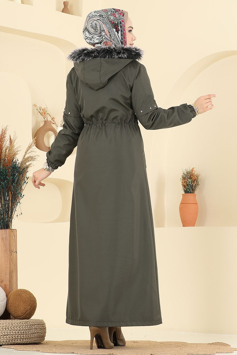 Ürün Özelliği : Yeni sezon tesettür moda ürünüdür. Beli bağcıklıdır. Önden kullanılabilir düğmeleri bulunmaktadır. Kapüşon seyyardır, isteğe bağlı kullanılmayabilir. Ürün Kapşonlu yakadır. Astarı kürklüdür.. Ürün Önden fermuarlıdır. Taş detayları çakımdır. Kapşon kürkü ürüne dikilidir. Cep mevcuttur. Manşet lastiklidir.Konsept fotoğraf çekimlerinden dolayı üründe ton farklılığı olabilir.