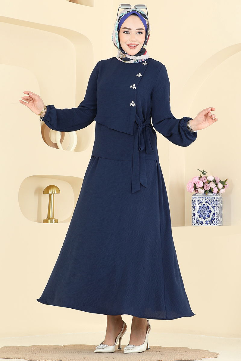 Taş Detaylı Etekli Takım, şıklığı ve rahatlığı bir arada sunan, dört mevsim kullanıma uygun bir tesettür ürünüdür. Hassas yıkama önerilen bu ürün, 30 derecede yıkanabilir ve aerobin kumaştan üretilmiştir. Bisiklet yakası, yanlardan ayarlanabilir bağcık detayı ve sırttan düğmeli tasarımı ile modern ve kullanışlıdır. Taş detayları göz alıcı bir zarafet katarken, etek belinin ve manşetlerin lastikli olması konforu artırır. Şık ve fonksiyonel tasarımı ile bu takım, özel günlerden günlük kullanıma kadar her ortam için idealdir.