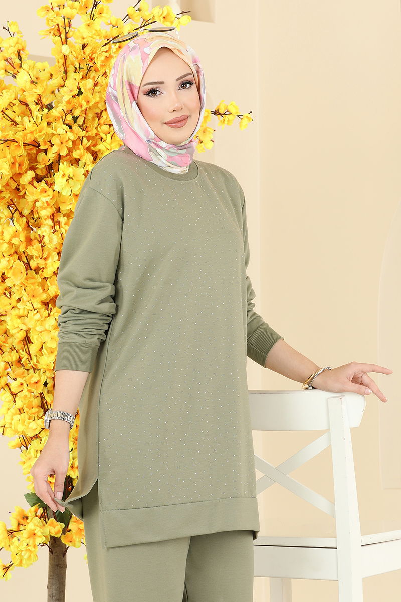 Ürün Özelliği : Yeni sezon tesettür moda ürünüdür. Ürün Bisiklet yakadır. Yırtmaçlıdır.. Astarsızdır. Taşlar yapıştırmadır. Pantolon beli lastiklidir. Konsept fotoğraf çekimlerinden dolayı üründe ton farklılığı olabilir.