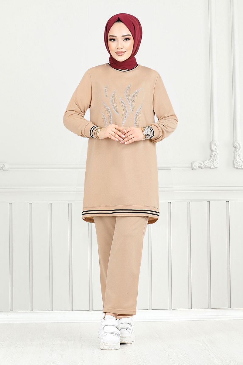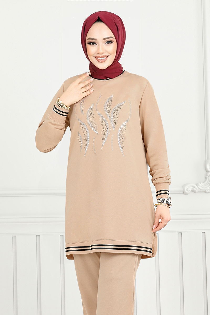 The Stone Detailed Dual Set is an elegant hijab fashion item suitable for all seasons. Made from dual thread fabric, this set offers both comfort and durability. The bicycle-neck tunic features side slits for a contemporary look and is unlined for light and comfortable wear. The pants' elastic waist provides maximum comfort. This duo promises an elegant and gracious style in any setting.