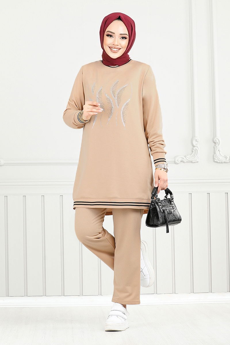 Taş Detaylı İkili Takım , tesettür giyimine şıklık katan dört mevsimlik bir üründür. İki iplik kumaştan üretilen bu set, konfor ve dayanıklılığı bir arada sunar. Bisiklet yakalı tunik, yanlardan yırtmaçlı tasarımıyla modern bir görünüme sahiptir. Astarsız olan tunik, hafif ve rahat bir kullanım sağlar. Pantolonun beli lastikli olduğundan maksimum konfor sunar. Bu ikili takım, her ortamda elegan ve nezaketli bir stil vadeder.