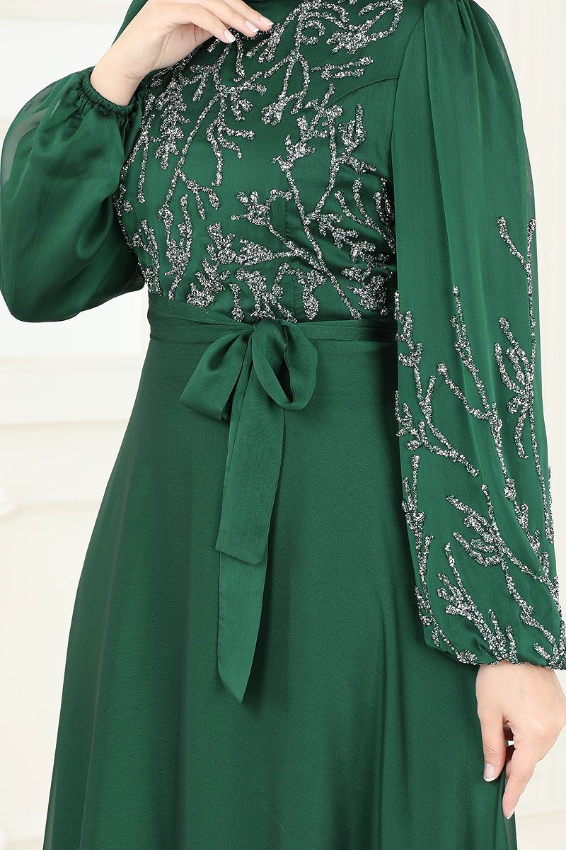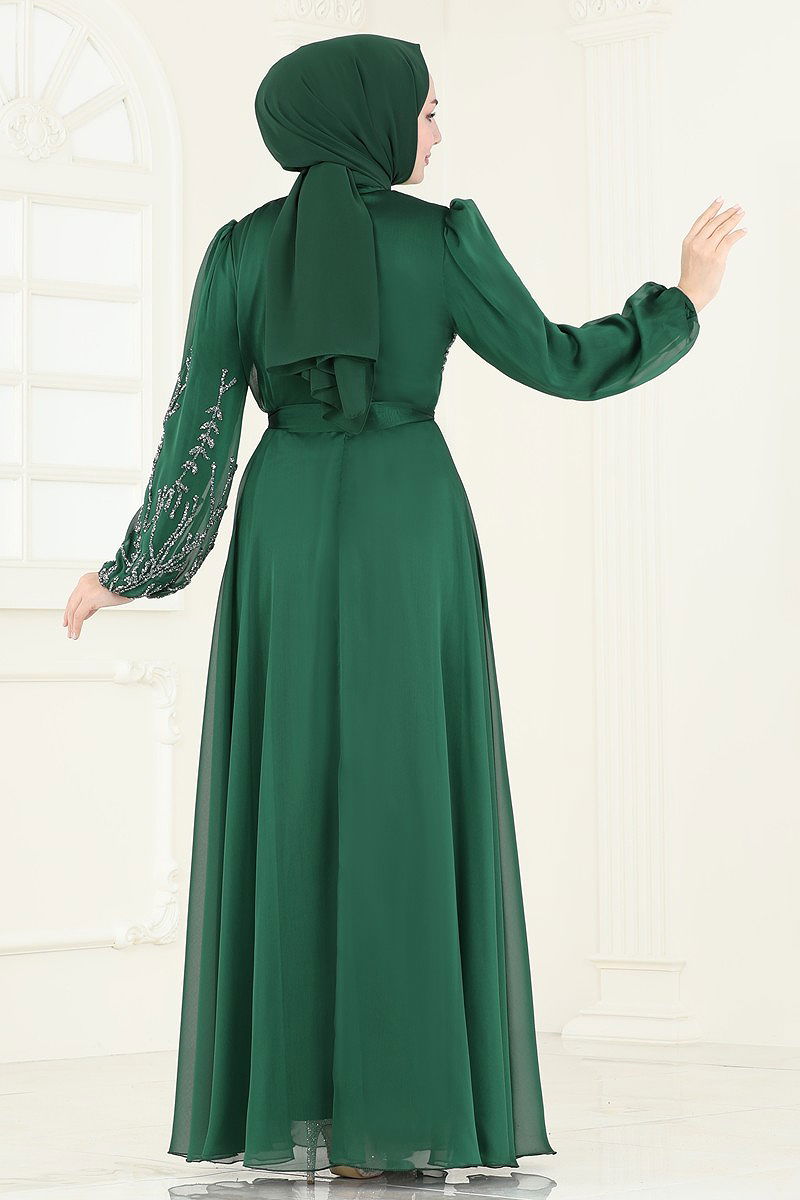 Stone Detailed Janjan Abaya is a model dress. It can be used in Four Seasons season. Dry cleaning should be done only. It is made of Janjan fabric. The product has a dominant collar. It is lined. The product has a back zippered. (The product on the model is size 38.) The two ends of the belt are stitched to prevent fluttering, and the middle part is left empty (seamless). The belt is included with the product and can be used optionally. The cuff is elastic.