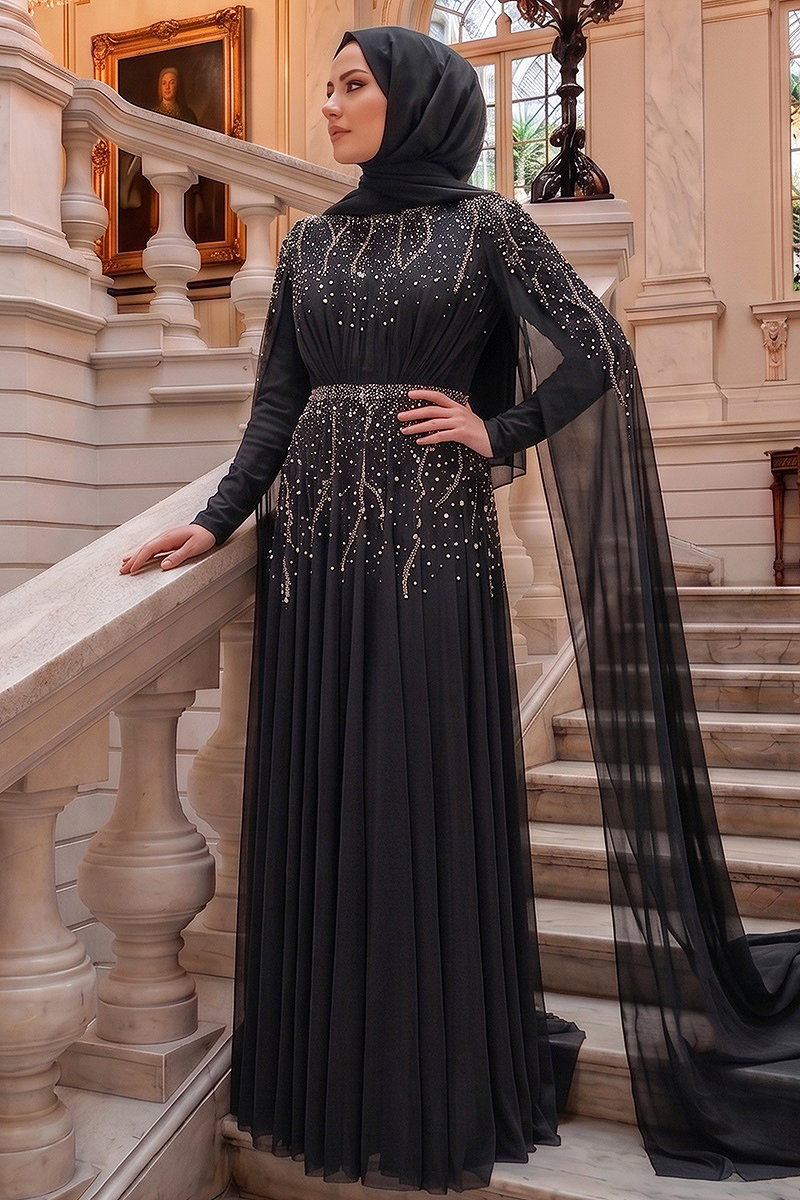 Taş Detaylı Şifon Abiye 5568DMNK1166 Siyah