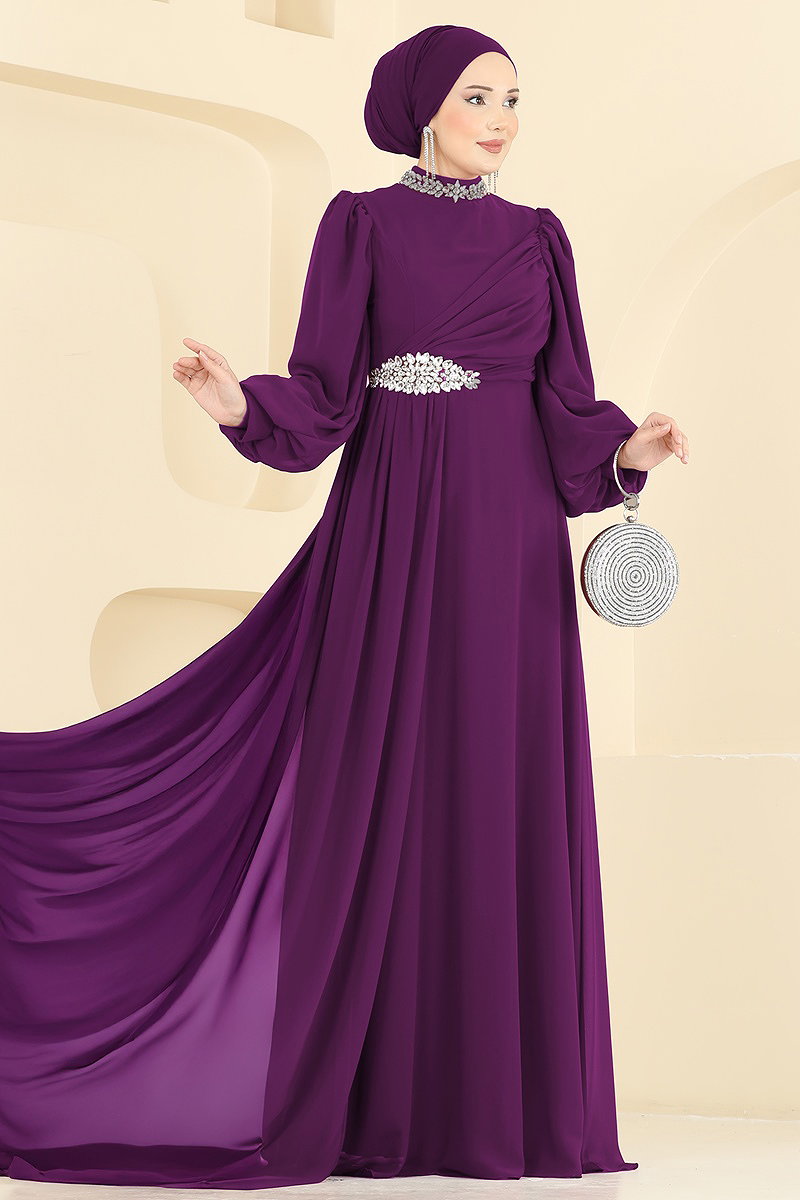 Taş Detaylı Şifon Abiye 6999YG95 Mor