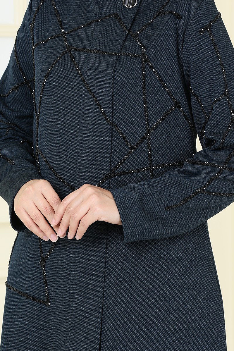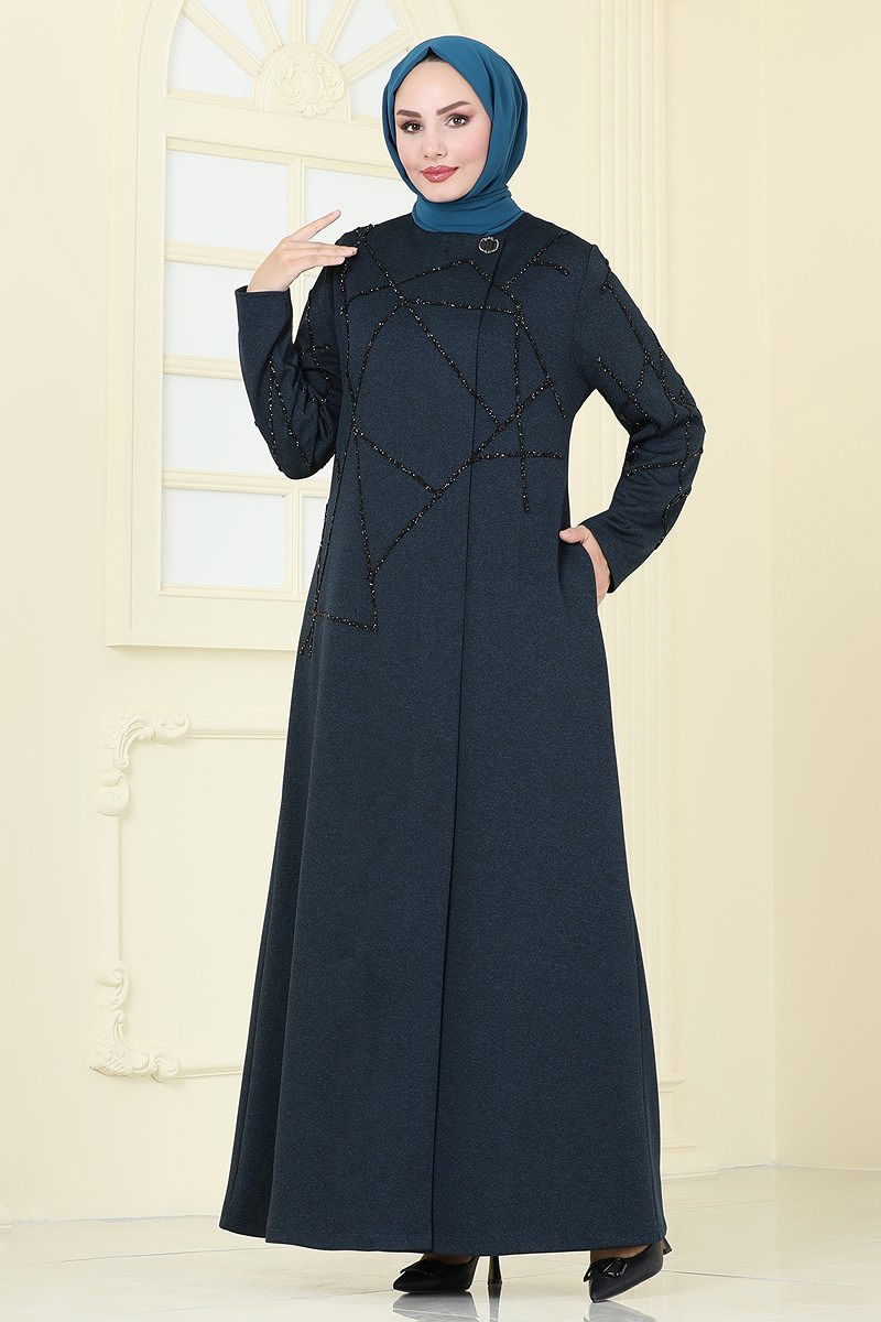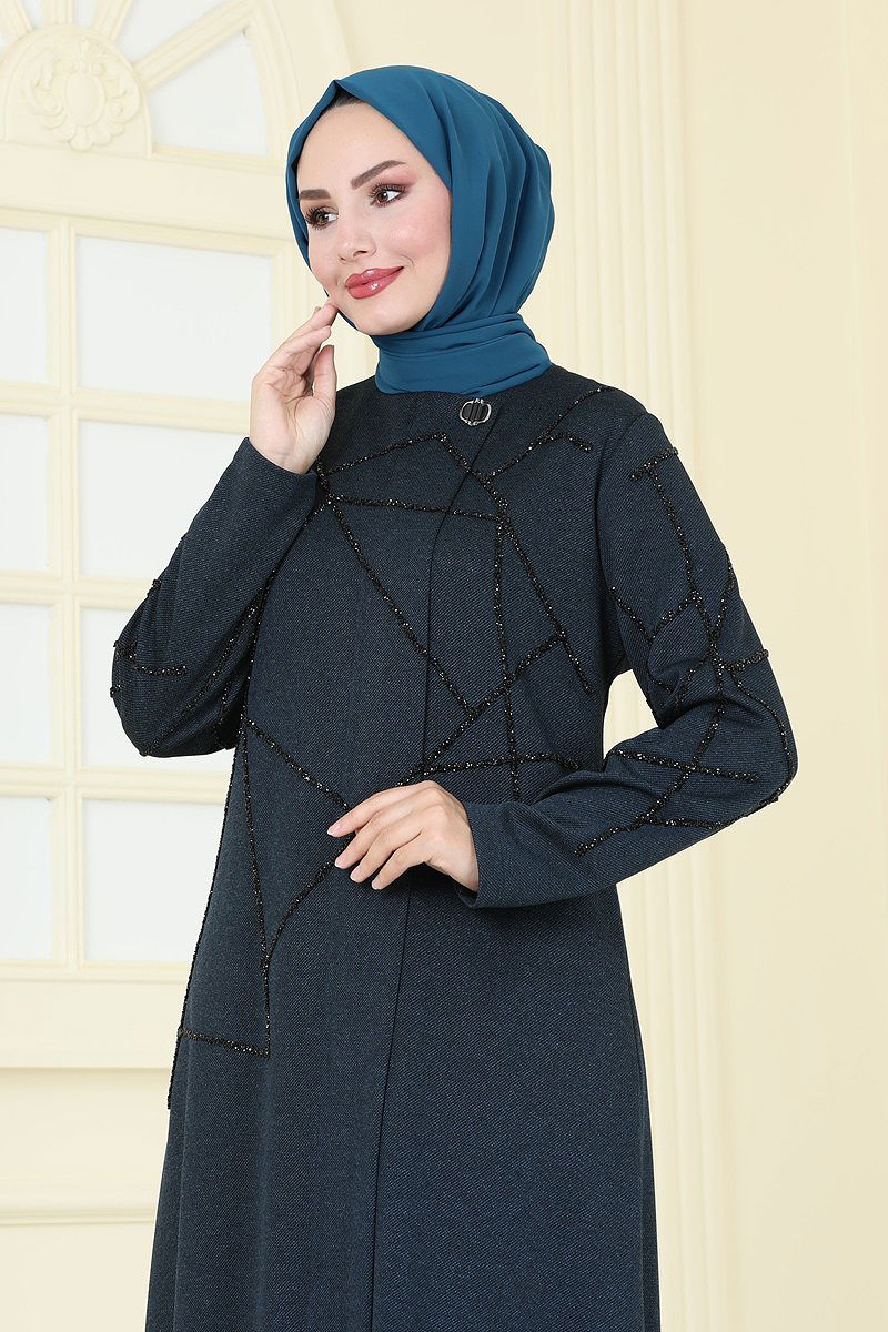 Taş Detaylı Şık Pardesü Ferace Petrol