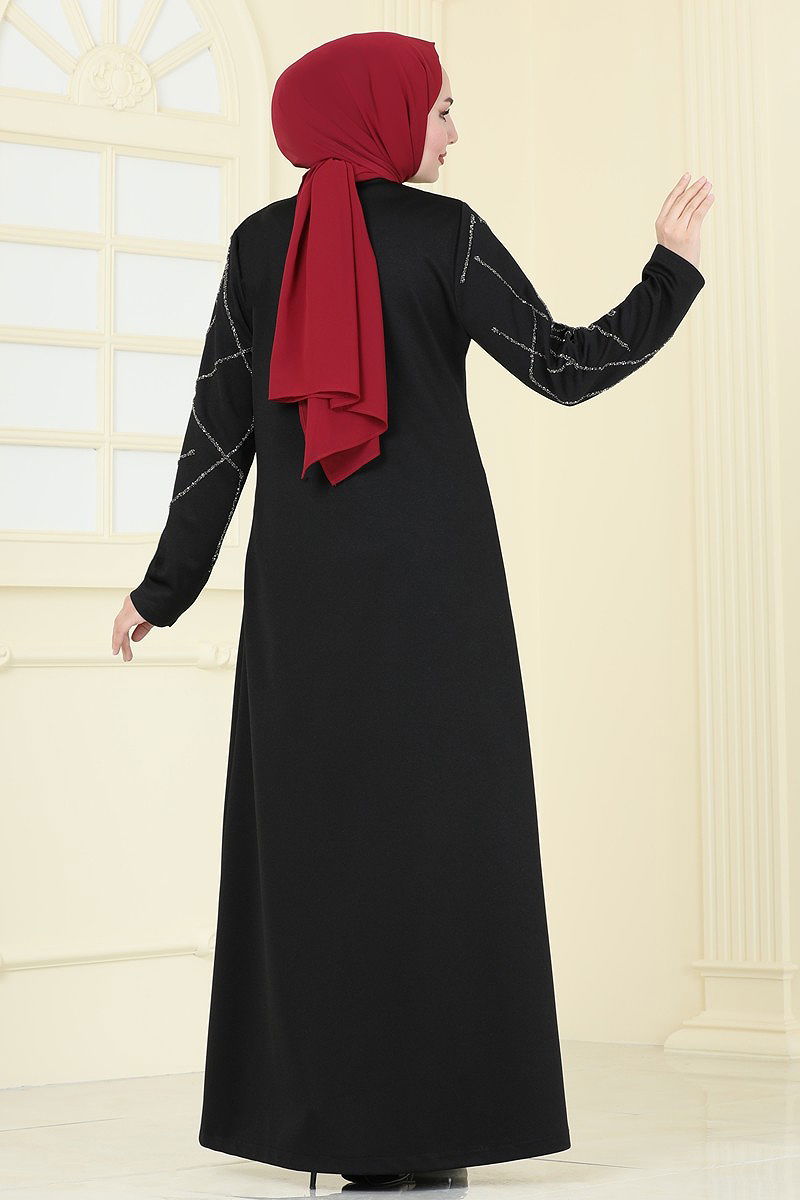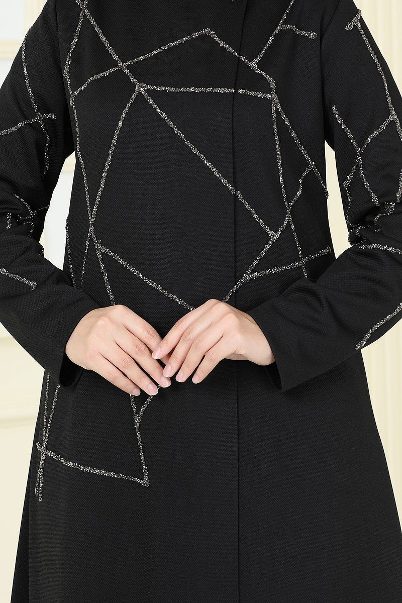 Taş Detaylı Şık Pardesü Ferace Siyah
