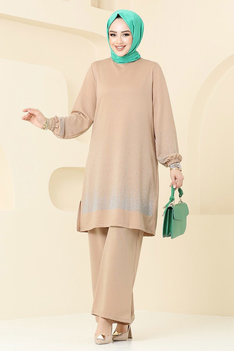 Ürün Özelliği : Yeni sezon tesettür moda ürünüdür. Ürün Bisiklet yakadır. Tunik yandan yırtmaçlıdır. Astarsızdır. Taşlar yapıştırmadır. Pantolon beli lastiklidir. Manşeti lastiklidir. Konsept fotoğraf çekimlerinden dolayı üründe ton farklılığı olabilir.