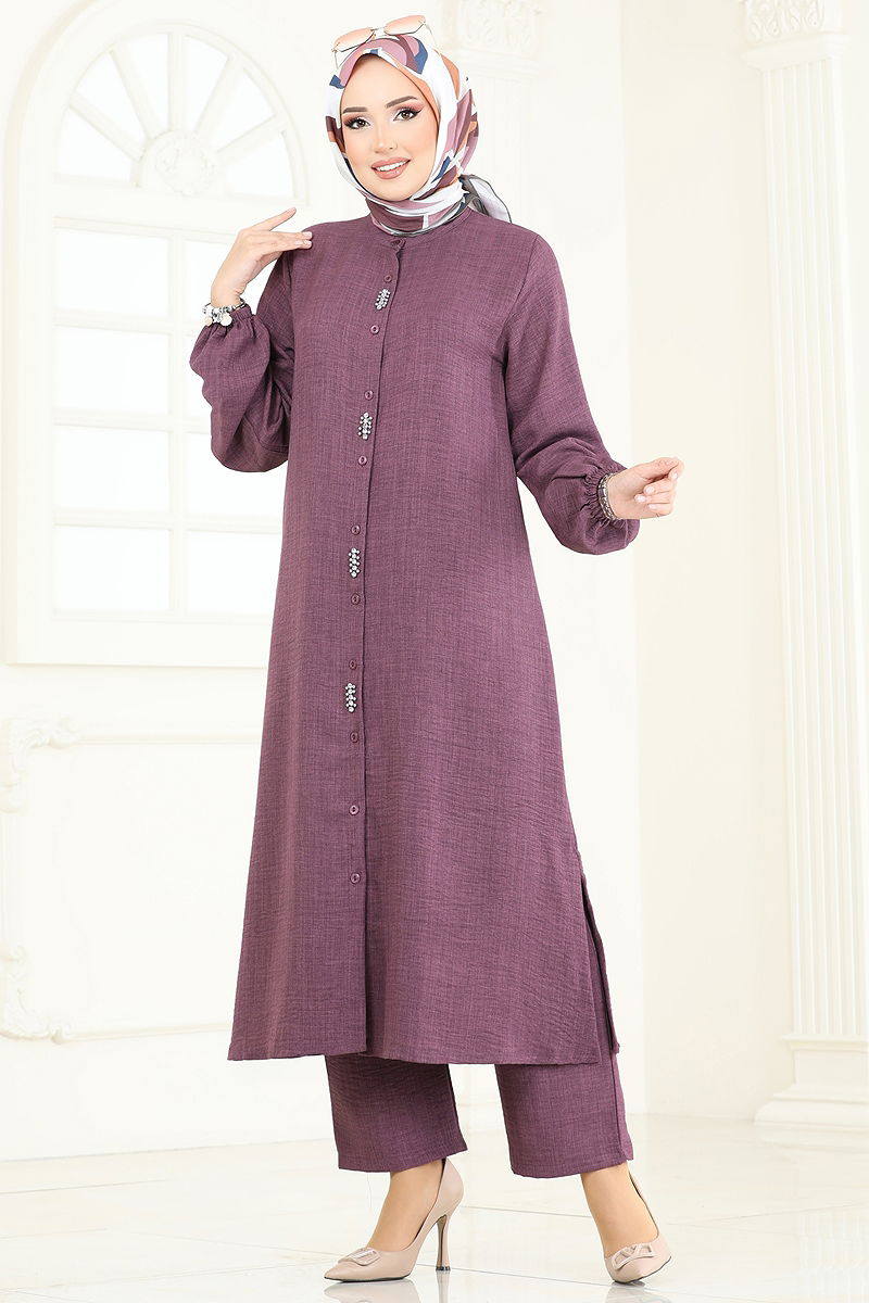 Product Feature : It is a new season hijab fashion product. The product has a Half Judge collar. The product has From the front buttons. The tunic has a side slash.. Unlined. Stone details are pebble. The waist of the trousers is elastic. The cuff is rubberized. There may be a tonal difference in the product due to concept photo shoots.