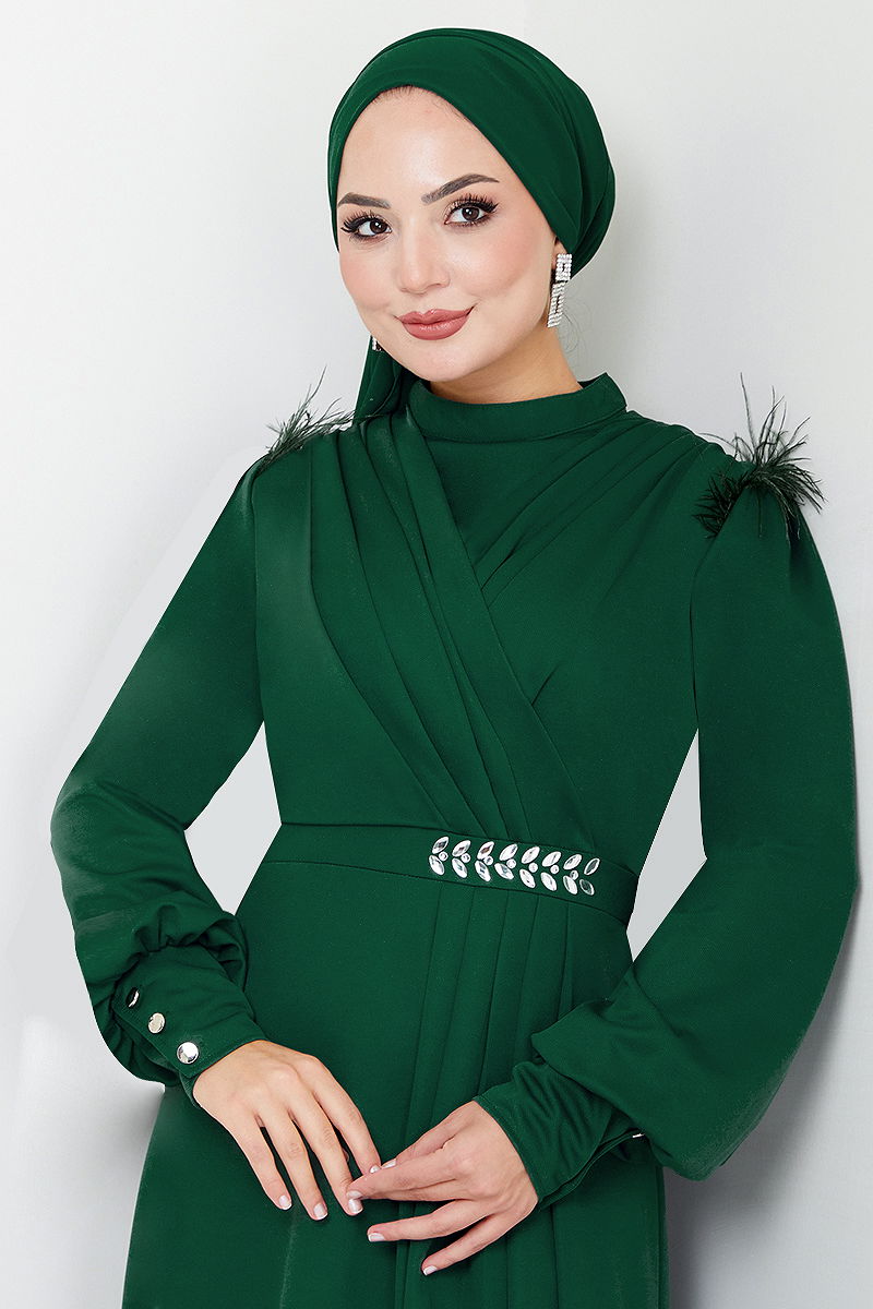 Taş Detaylı Tesettür Abiye Zümrüt