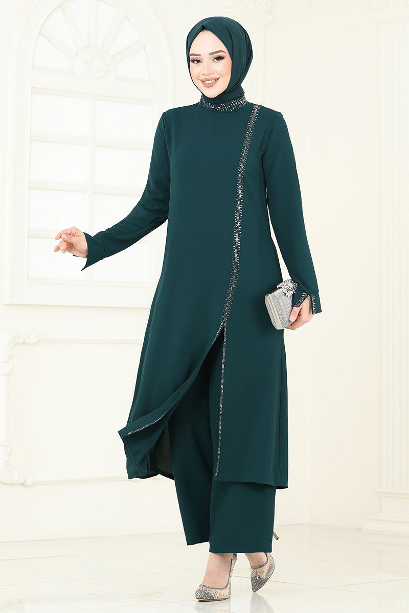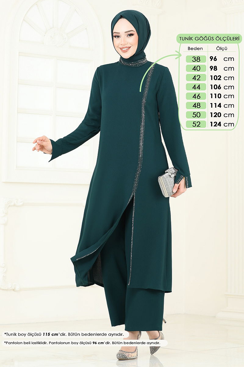 Ürün Özelliği : Yeni sezon tesettür moda ürünüdür. Ürün Hakim yakadır. Tunik yandan yırtmaçlıdır.. Astarsızdır. Ürün Sırttan fermuarlıdır. Taşlar yapıştırmadır. Pantolon beli lastiklidir. Manşeti lastiklidir. Konsept fotoğraf çekimlerinden dolayı üründe ton farklılığı olabilir.
