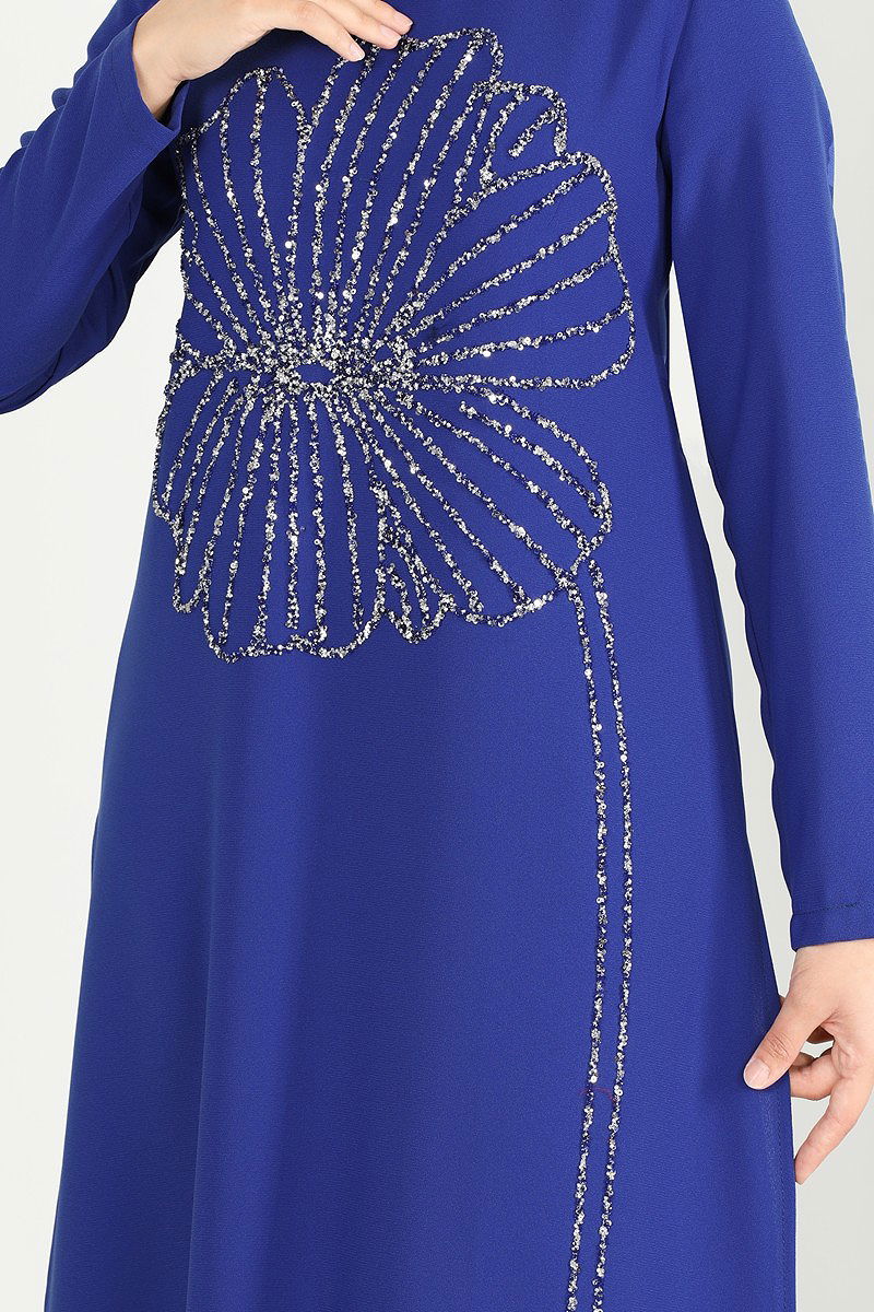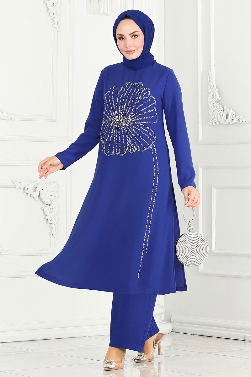 Taş Detaylı Tesettür Takım Saks