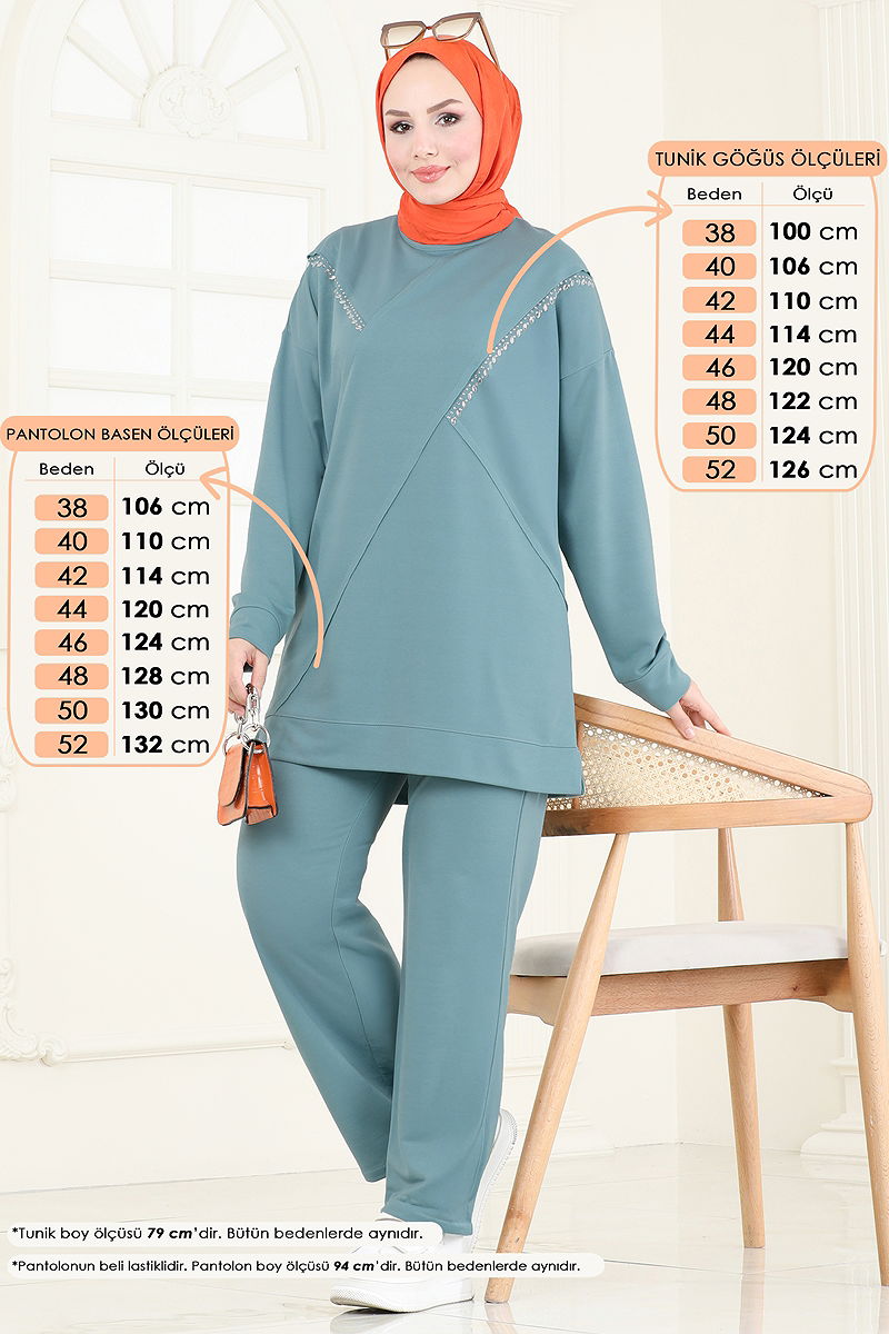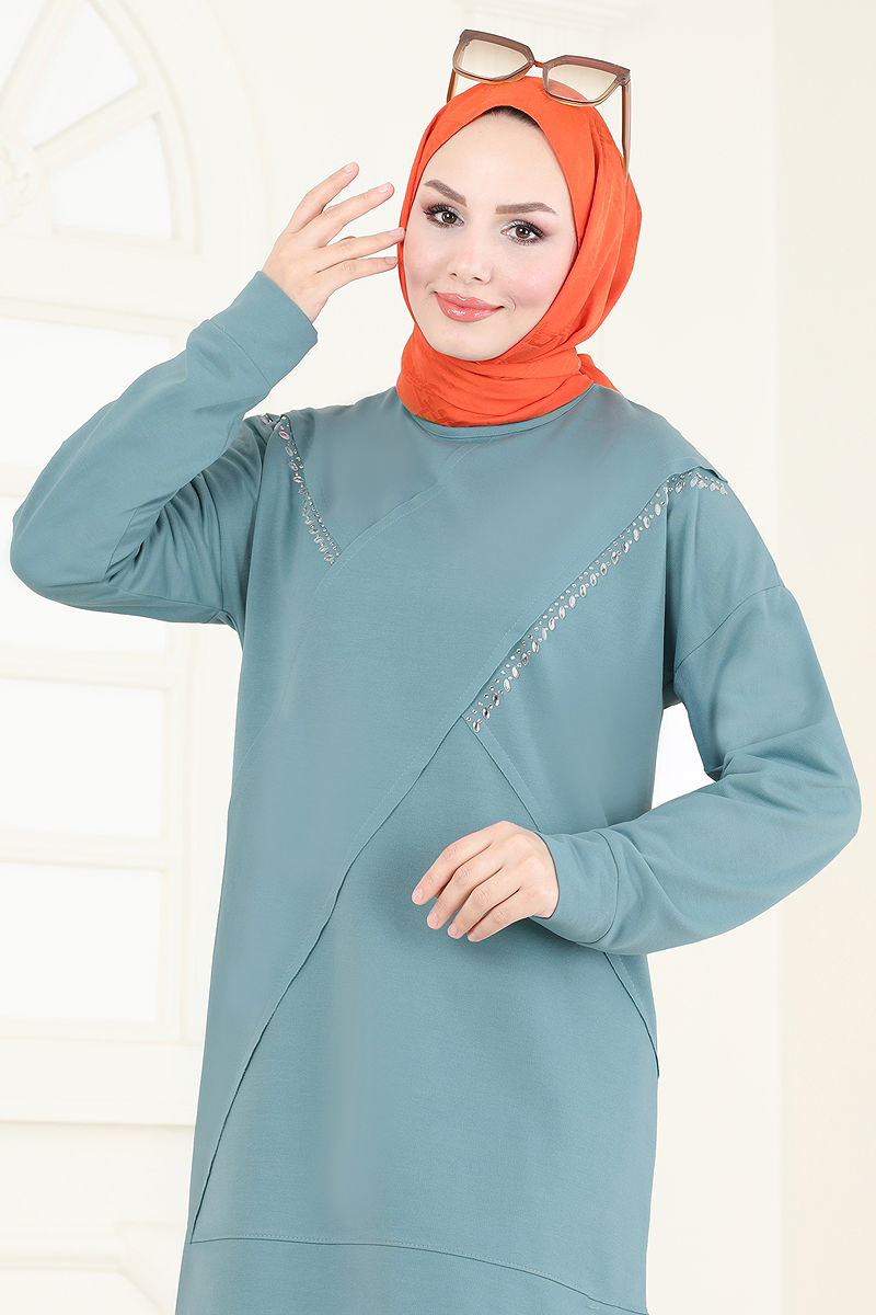 Taş Detaylı Tesettür Takım Mint